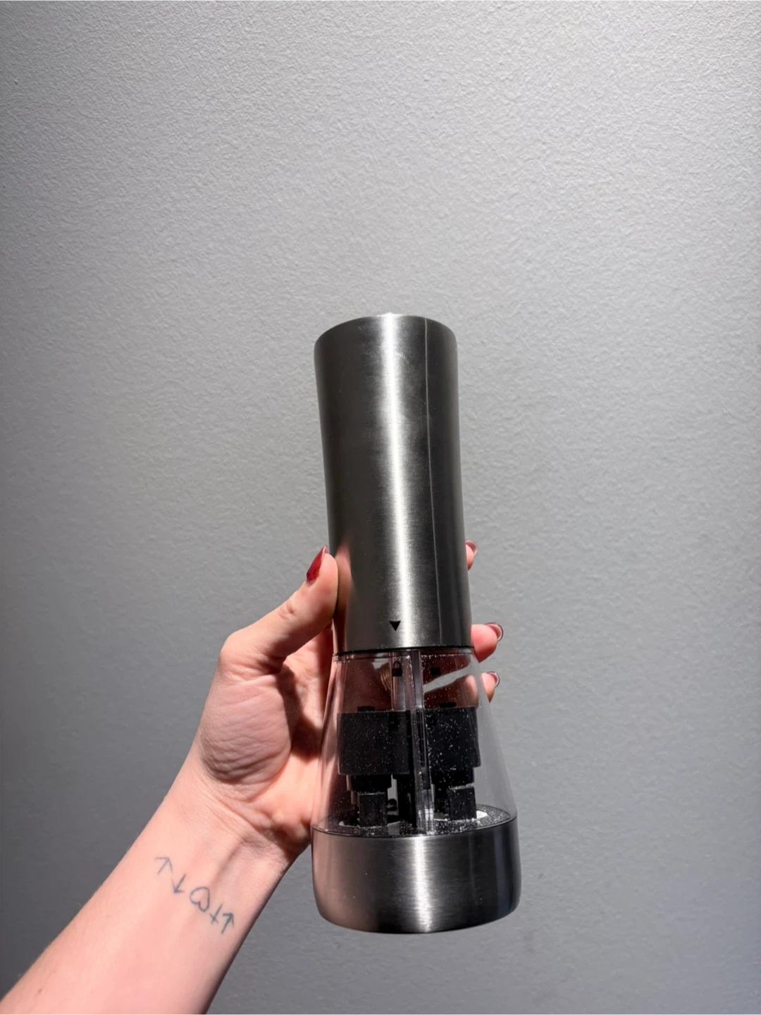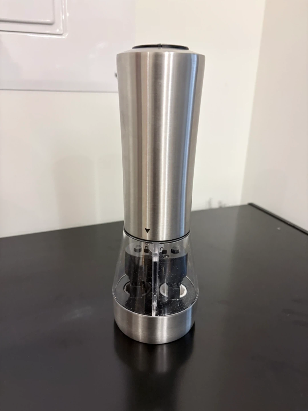 This electric grinder set makes seasoning your meals a breeze. It's constructed with durable stainless steel and a clear acrylic reservoir. It is battery operated.