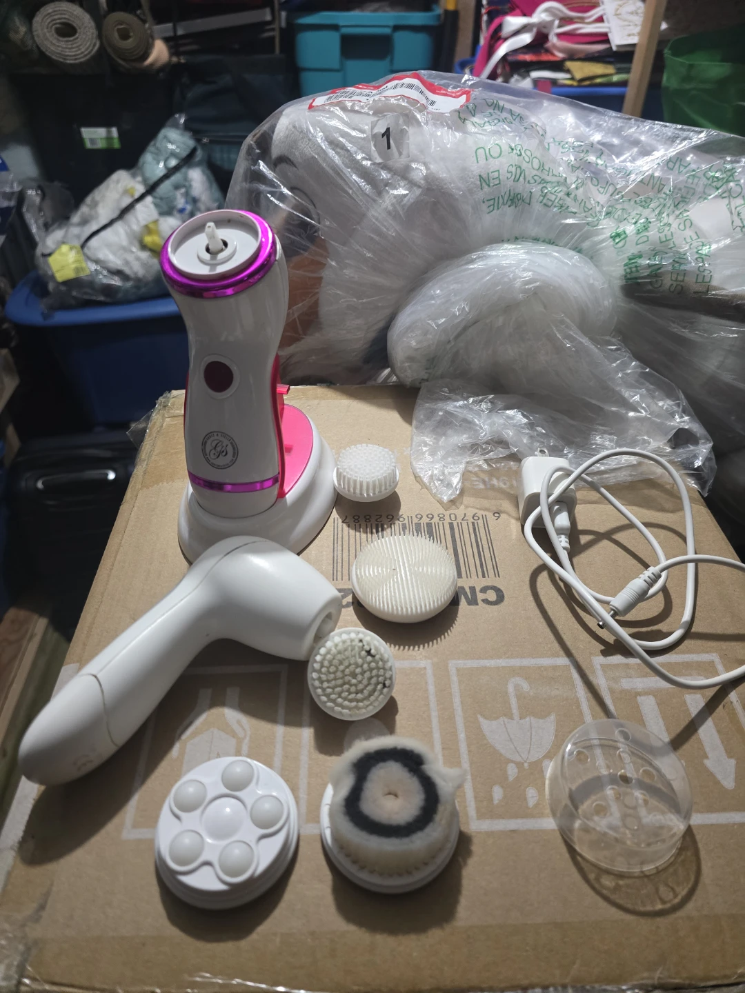 This 3-in-1 waterproof pro exfoliating spin brush is a cleansing system that removes dirt, exfoliates, and smooths skin. It comes with 4 attachments: 2 soft bristle brush heads, 1 silicone brush head, 1 massage ball brush head, a USB charger, and a charging stand. It has 2 speed functions and up to 2 hours of continuous spinning action with a full USB charge.