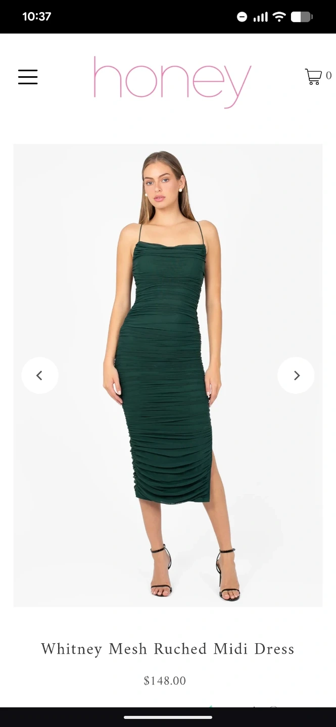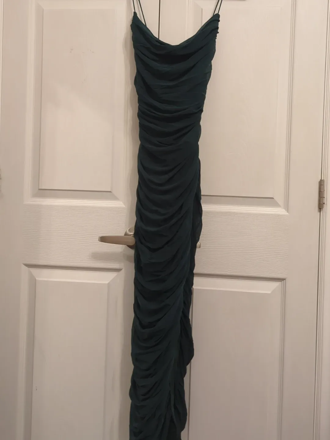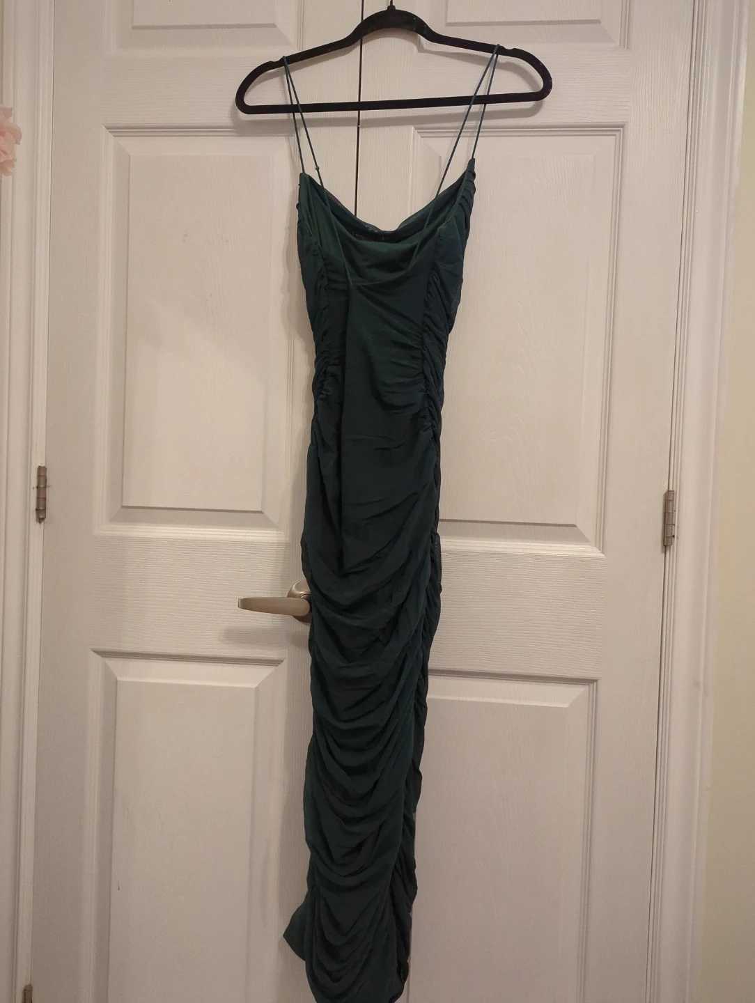 This is the Honey Whitney Mesh Ruched Midi Dress in a deep green colour. It's a size medium with spaghetti straps and a ruched design. It's a beautiful dress for an evening out! (Only worn once!!)