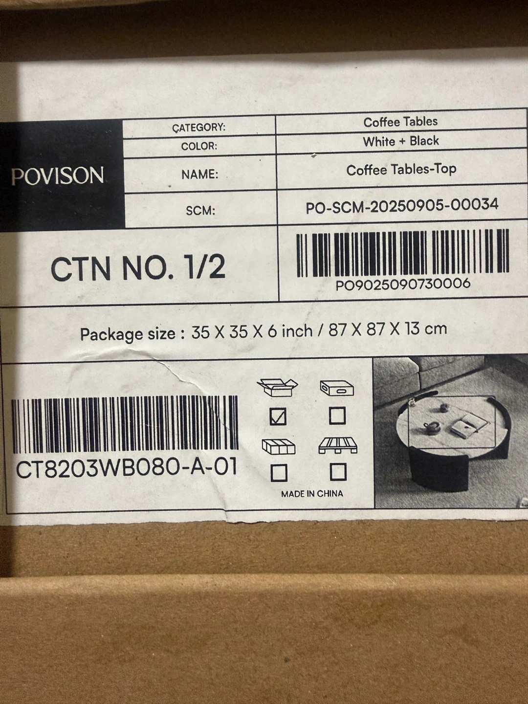 This is a POVISON coffee table top. Color is white and black. Package size: 35 X 35 X 6 inches or 87 X 87 X 13 cm. Made in China.