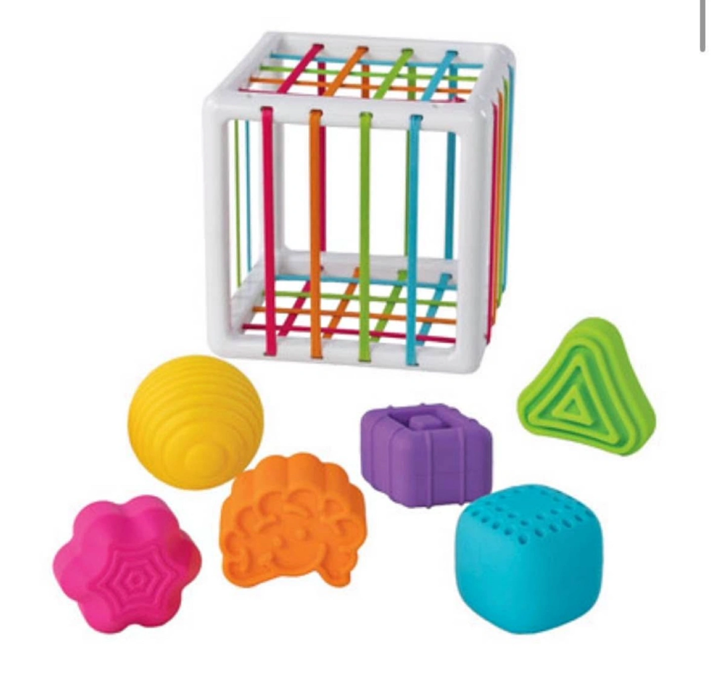 Here is a colorful shape sorter cube, perfect for a child to learn about shapes and colours. The shapes can be placed into the cube, and the ribbons can be pulled to release them. The shapes are different shapes and colours.