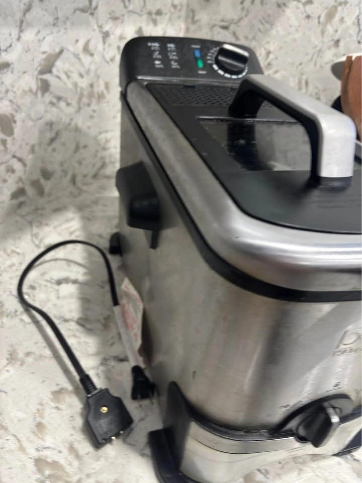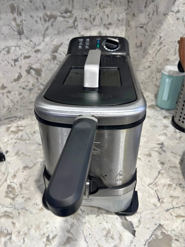 Kalorik deep fryer in good working condition. Has built-in oil filtration system and temperature control. Great for fries, chicken, wings, etc. Includes basket and lid.