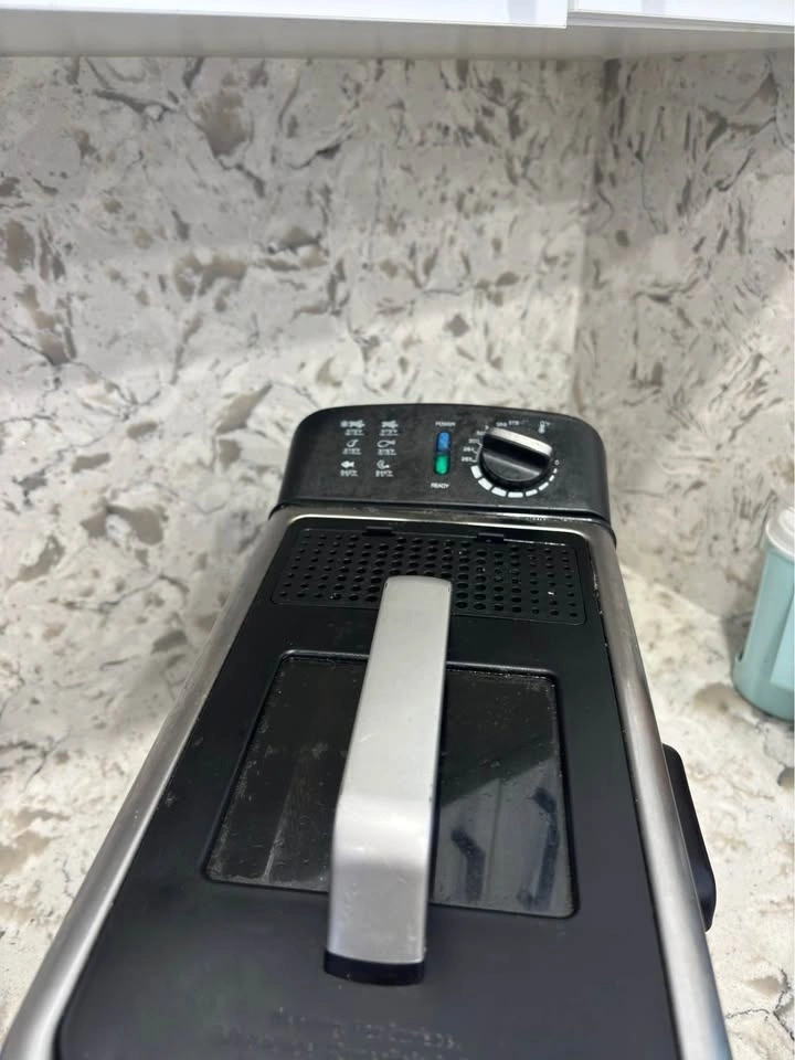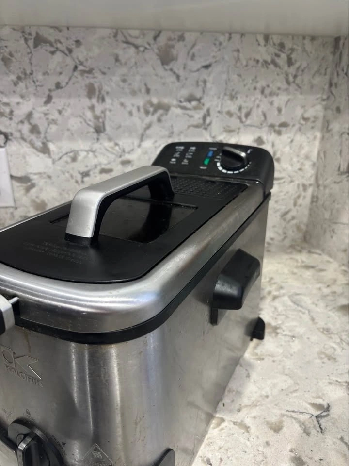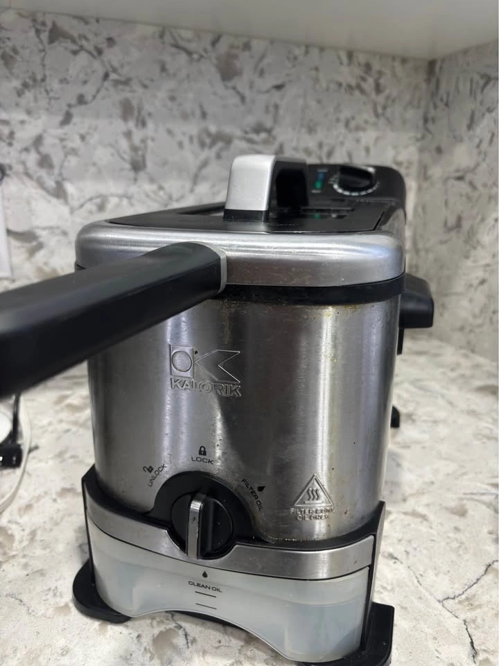 Kalorik deep fryer in good working condition. Has built-in oil filtration system and temperature control. Great for fries, chicken, wings, etc. Includes basket and lid.