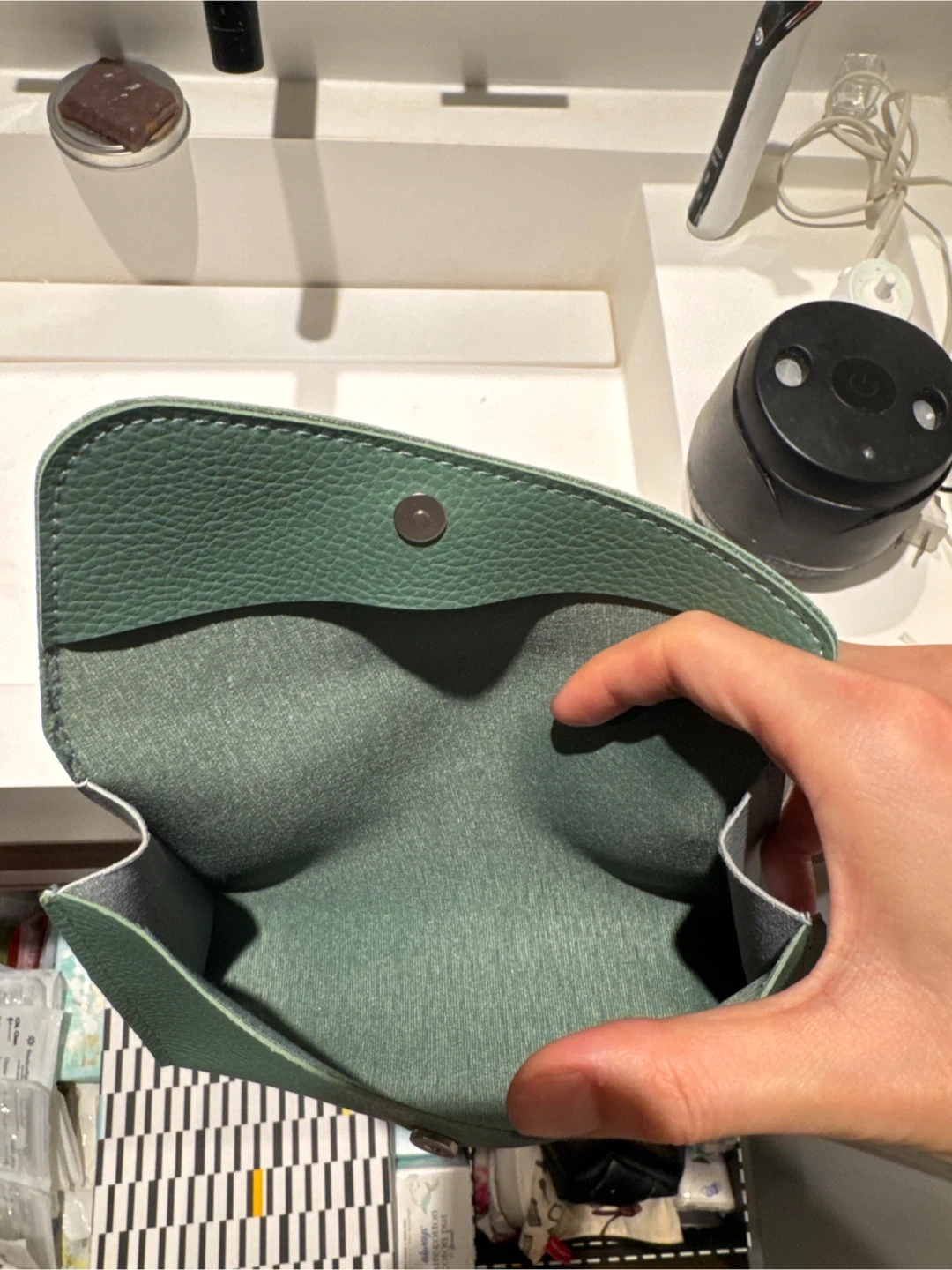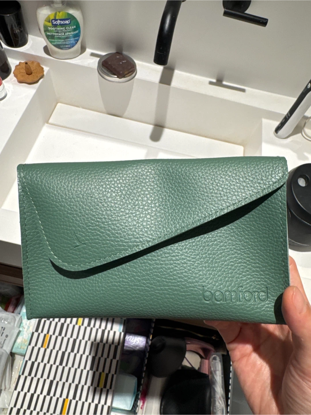 This is a Bamford green pouch. It's a versatile size for makeup, travel essentials, or organizing small items. Snap closure keeps contents secure.