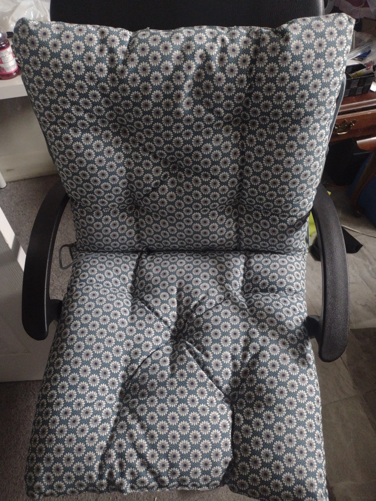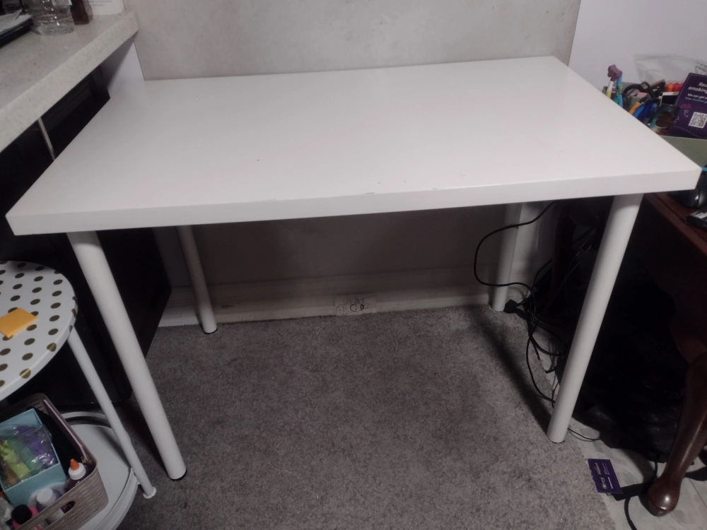 4 items included. (1) White IKEA desk with a (2)black fabric office chair. The desk has a few small scratches. The chair has a (3) floral comfy cushion. And an (4) anti-scratch mat for your floor, shown propped against the wall behind the desk.