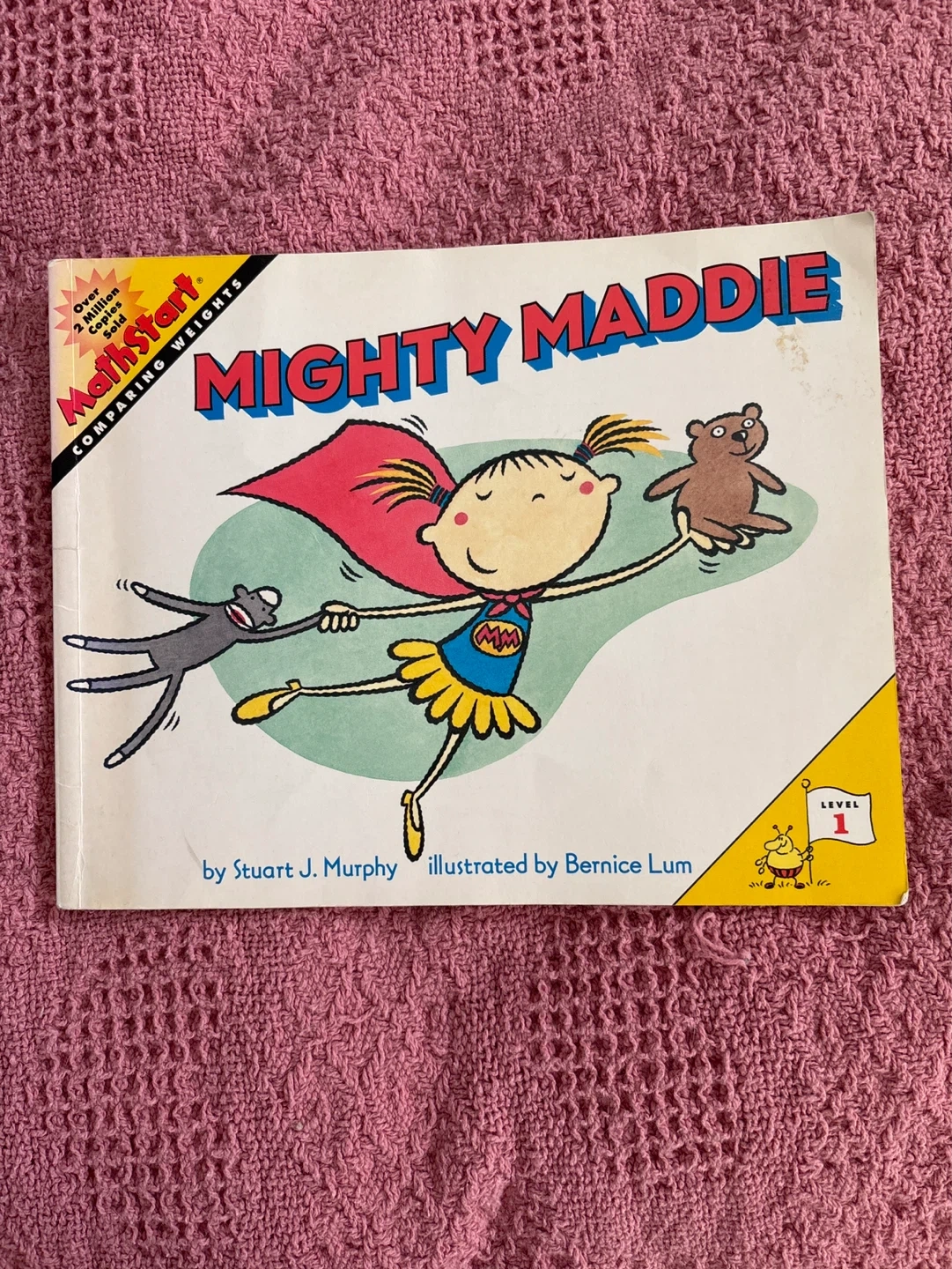 This MathStart book, Mighty Maddie, teaches kids about comparing weights. It's Level 1 and illustrated by Bernice Lum. Fun activities are included inside!