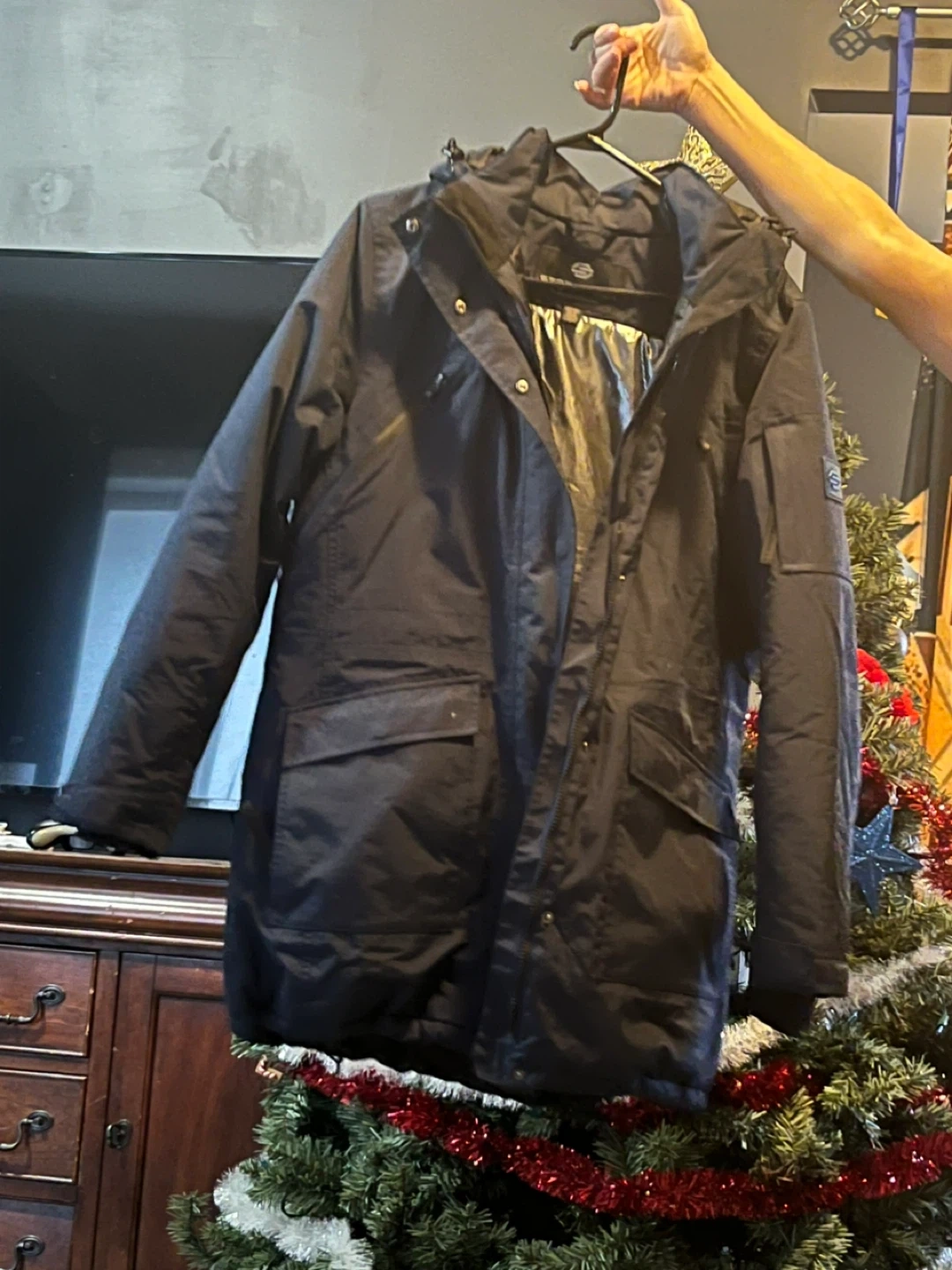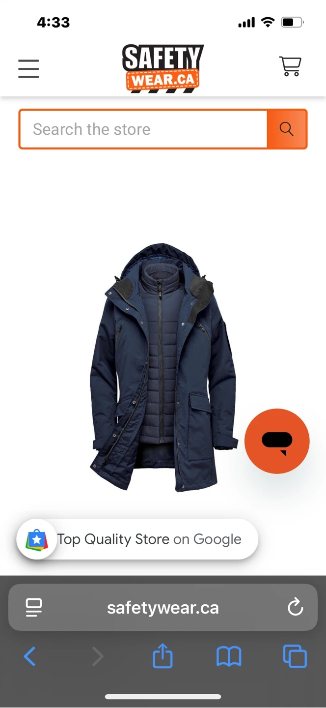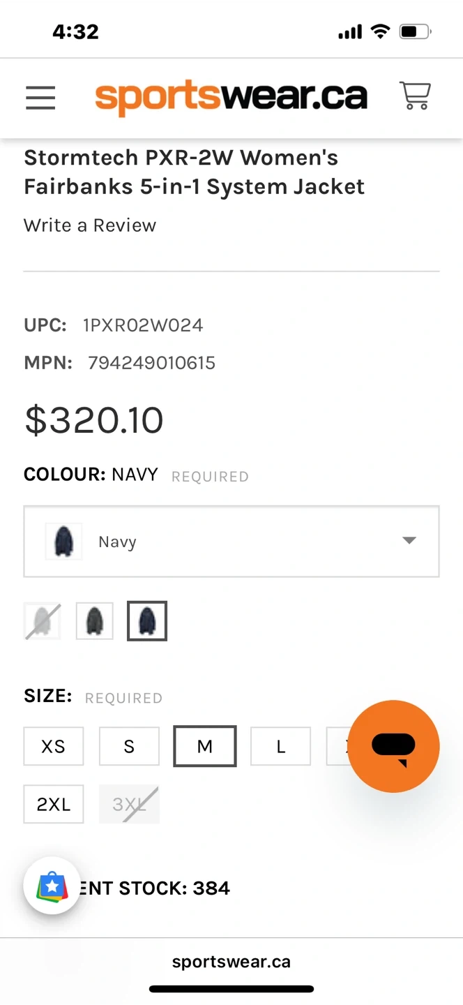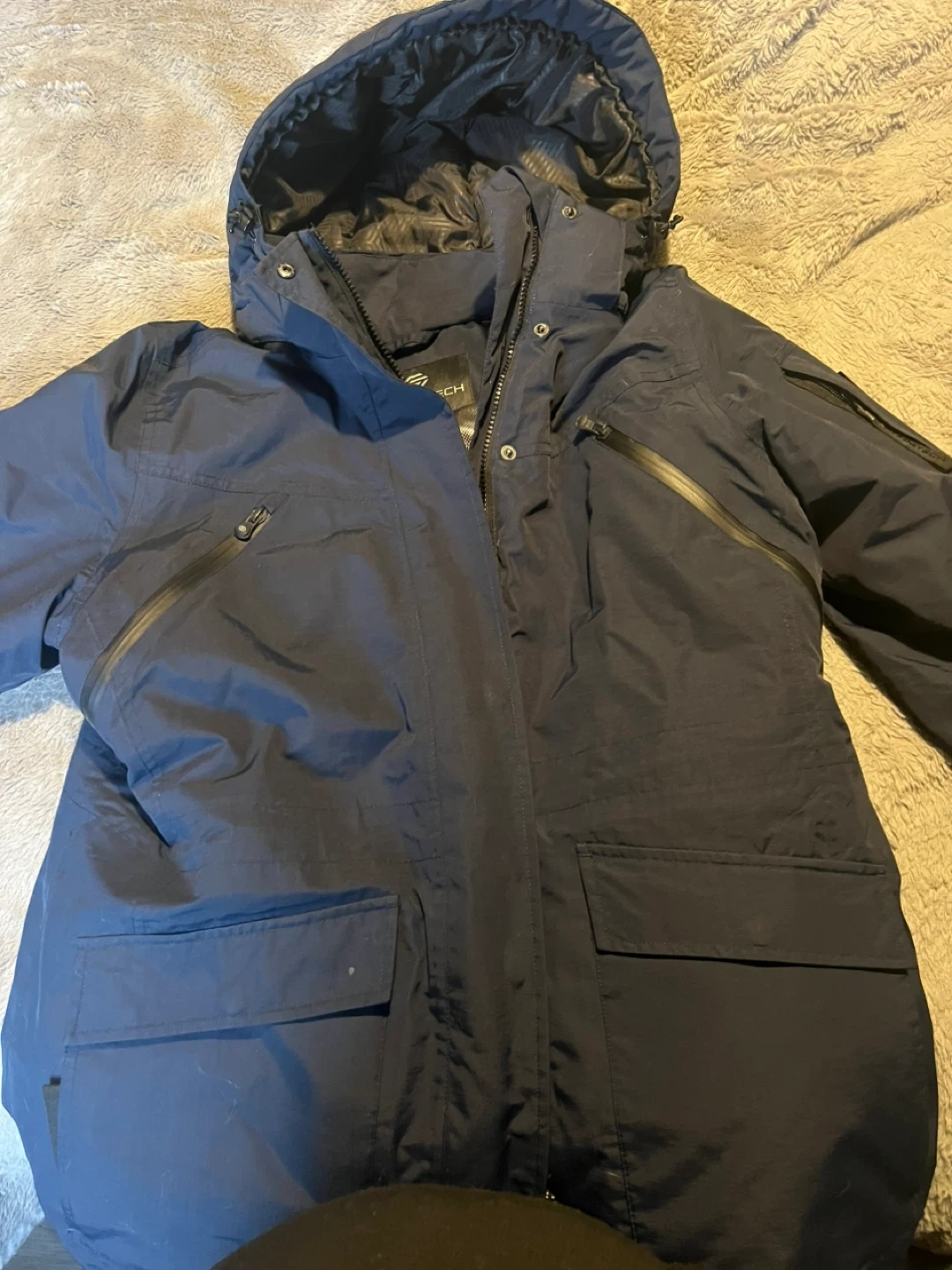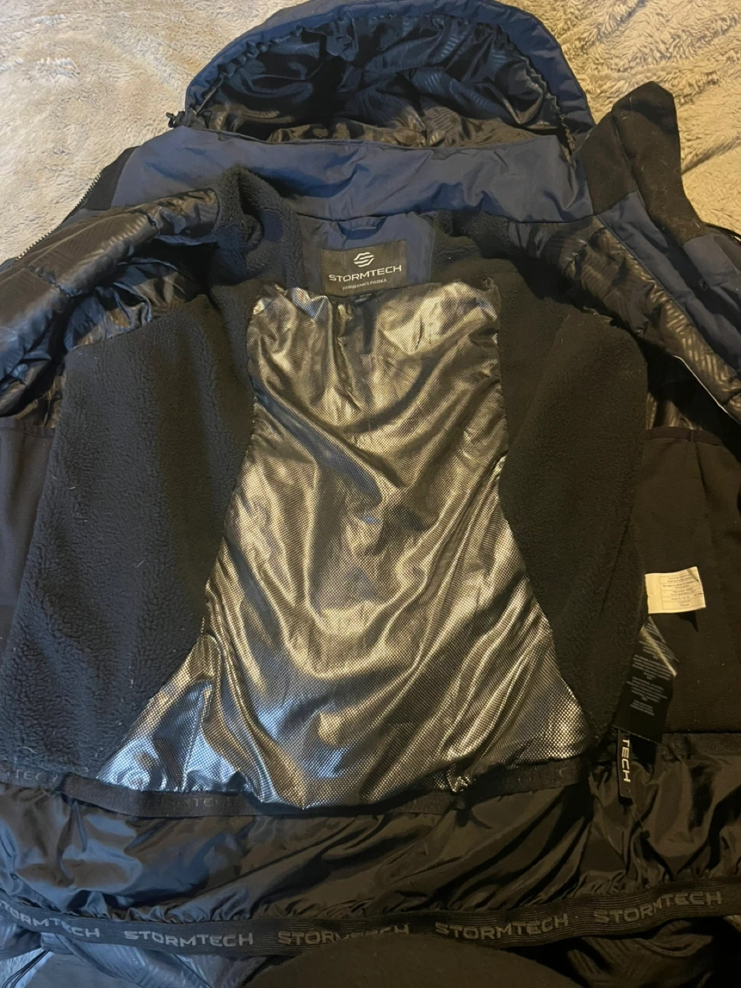Dark navy StormTech insulated parka jacket. Suitable for cold weather conditions. Made in Vancouver