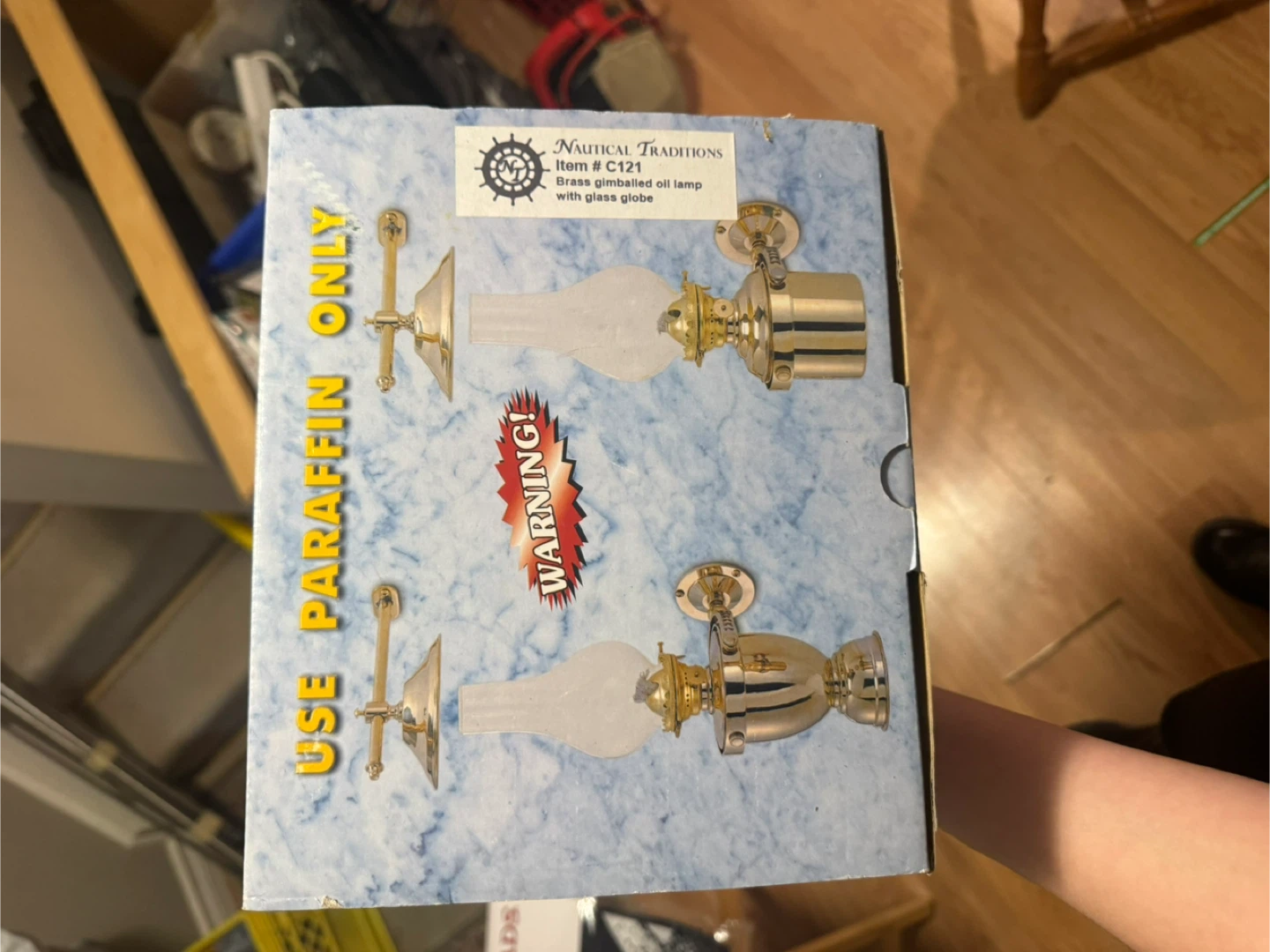 Nautical Traditions brass gimballed oil lamp with glass globe. Uses paraffin only. It's a brass construction with a glass globe.