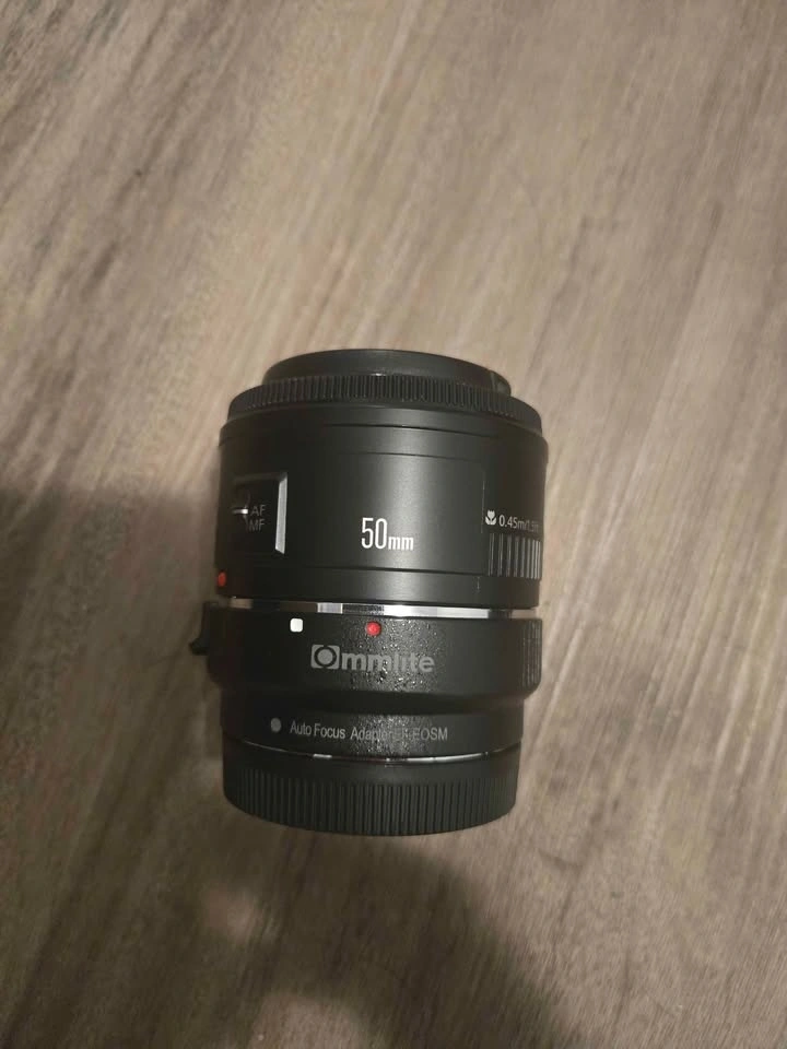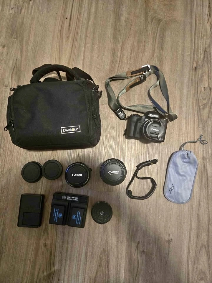 Canon EOS M50 Mirrorless Camera with kit lens (15-45mm), Canon Mount Adapter EF-EOS M, Canon EF 50mm f/1.8 STM, Canon EF Telephoto Zoom Lens 55-200mm f/4.5-5.6 II USM, Oreo Disposable camera lens, 1 original Canon battery + 2 third party batteries, Peak Design leash Camera strap + accessories, Canon wrist strap, and camera bag. Slight tear at the bottom corner but does not affect camera performance.