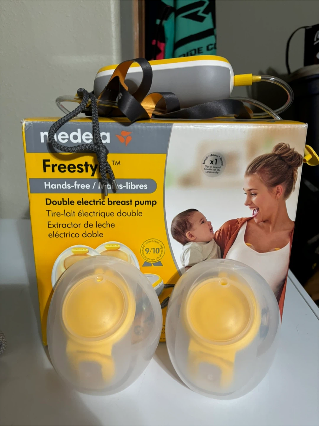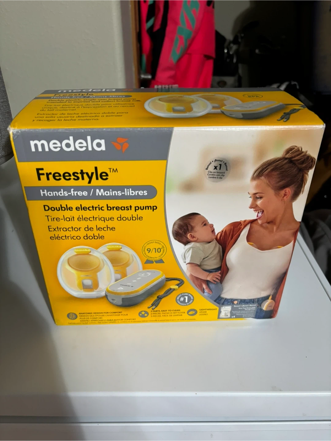 Medela Freestyle double electric breast pump. It's designed for hands-free use. Includes the pump unit and accessories as shown, works great just doesn’t get used anymore. Washed and sterilized