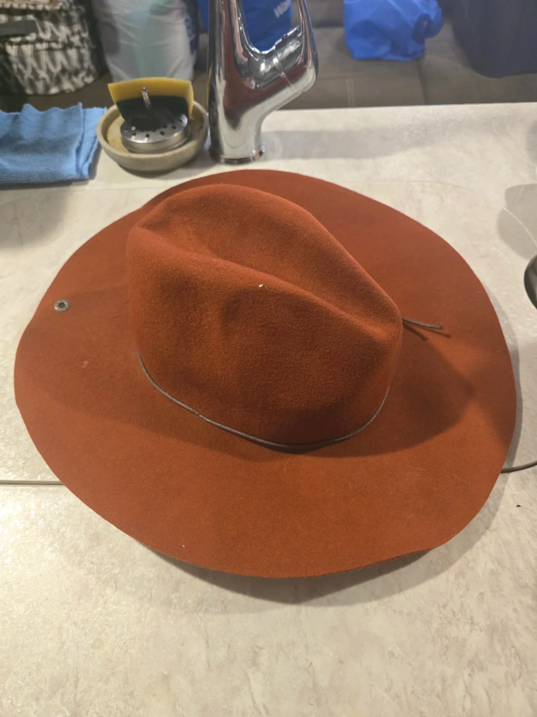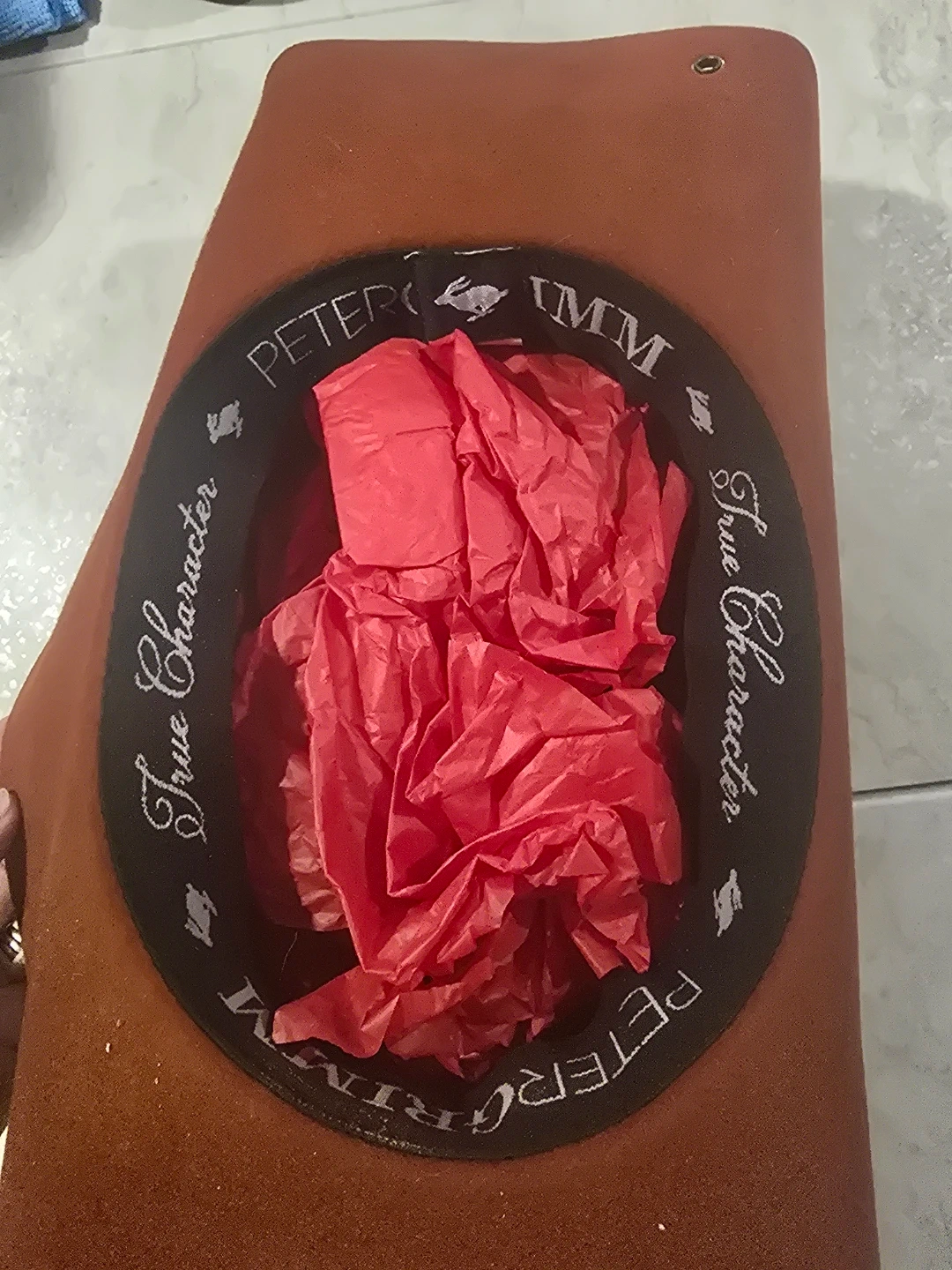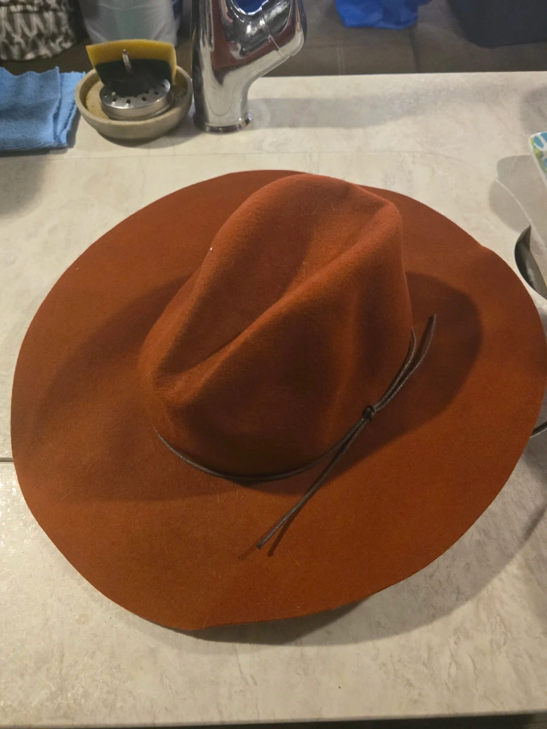 This is a Peter Grimm "True Character" cowboy hat. It's a stylish wide-brimmed hat in a reddish-brown colour. This hat is perfect for adding some flair to any outfit!