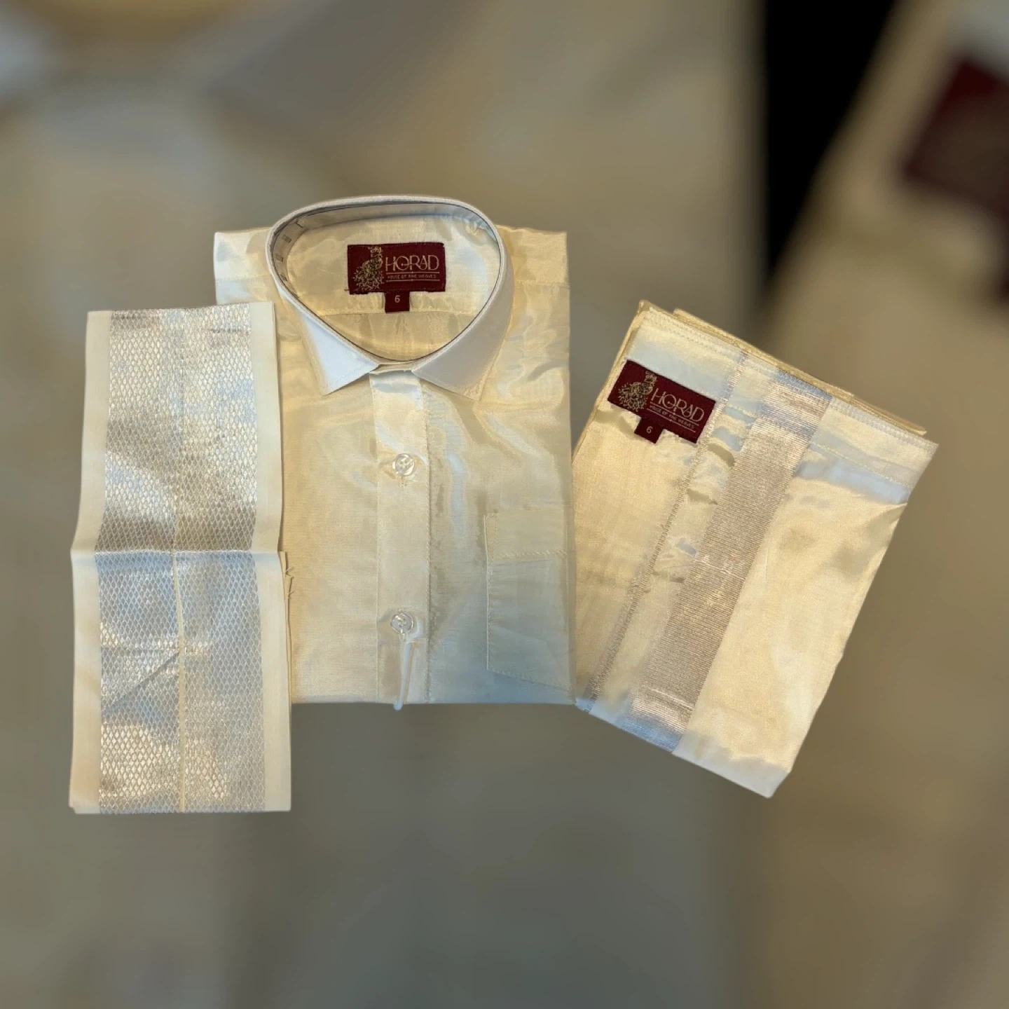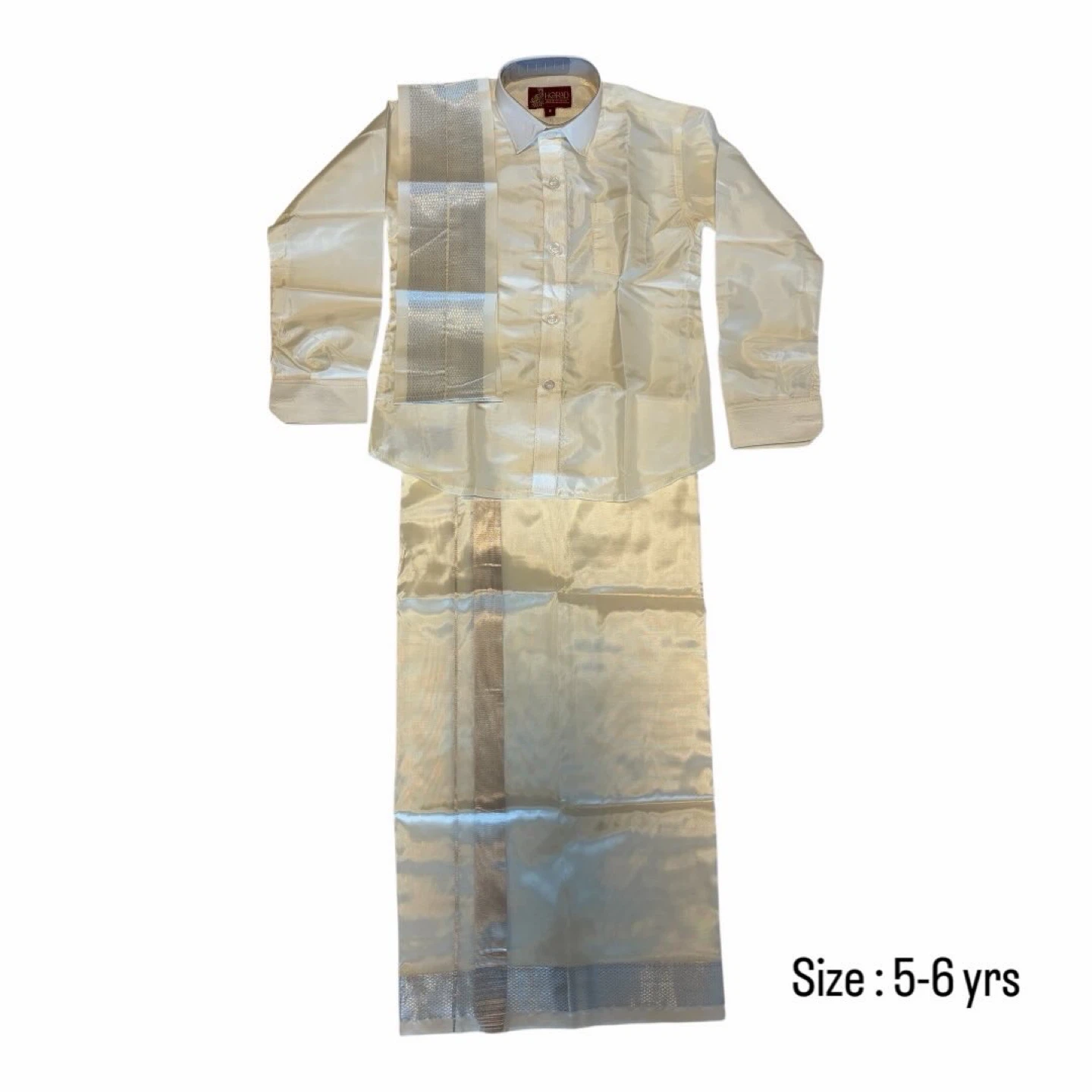This cream-coloured dhoti shirt set is for kids aged 5-6 years. The set includes a long-sleeved shirt and a dhoti with ornate silver trim. It's a lovely traditional outfit!