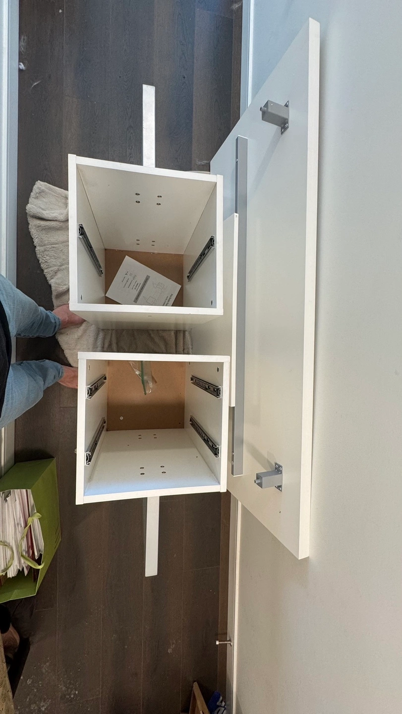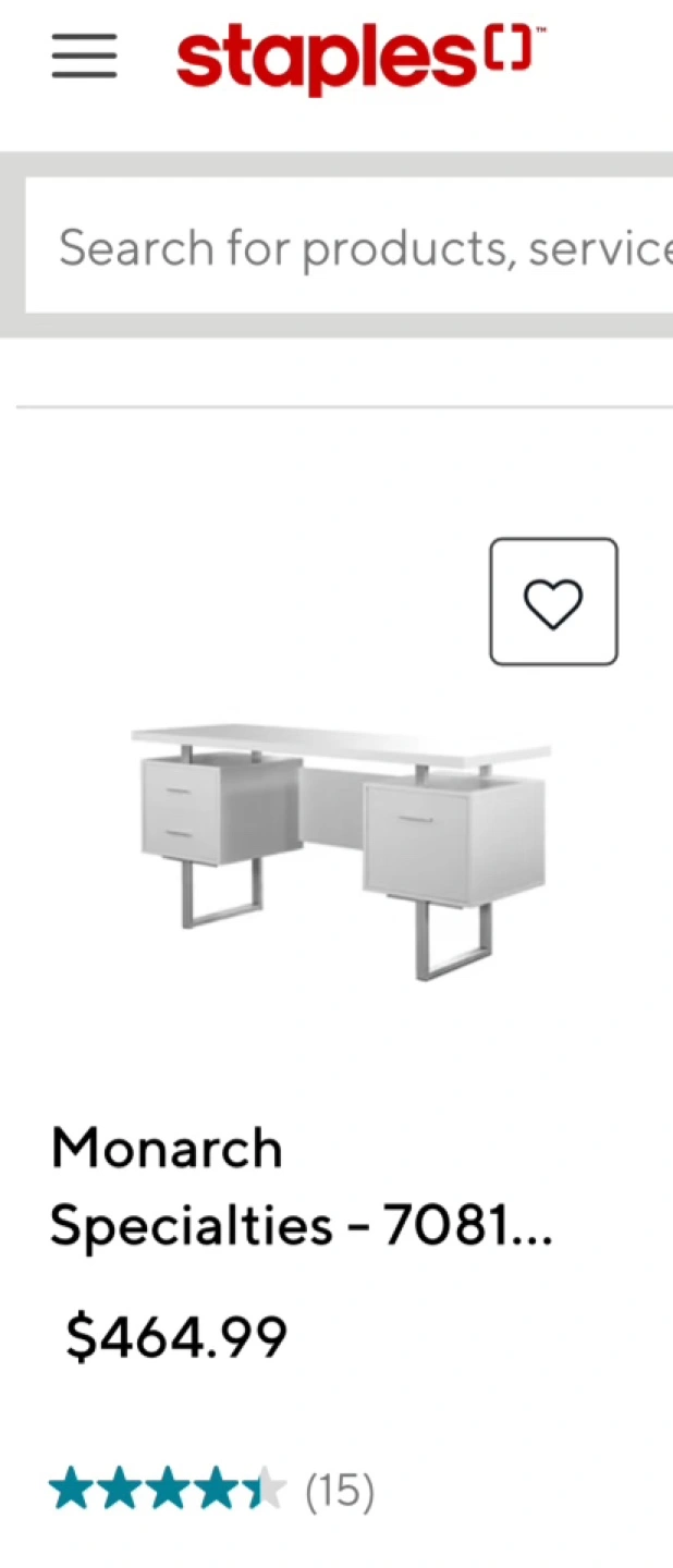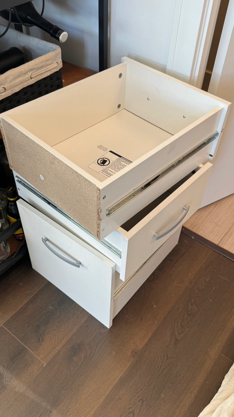 White computer desk, two drawers. Minimalist design. Metal legs. Some assembly required. Good condition.