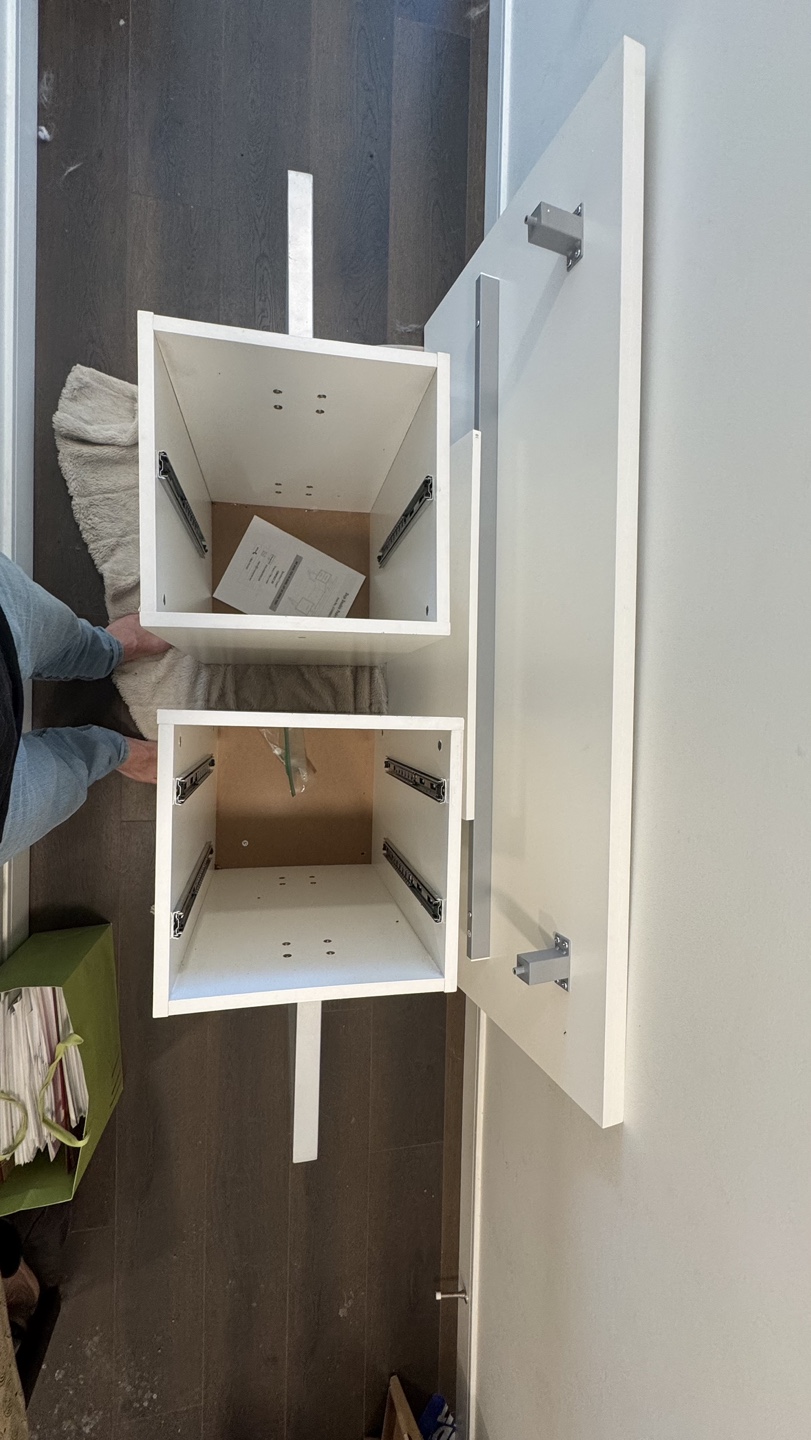 White computer desk, two drawers. Minimalist design. Metal legs. Some assembly required. Good condition.