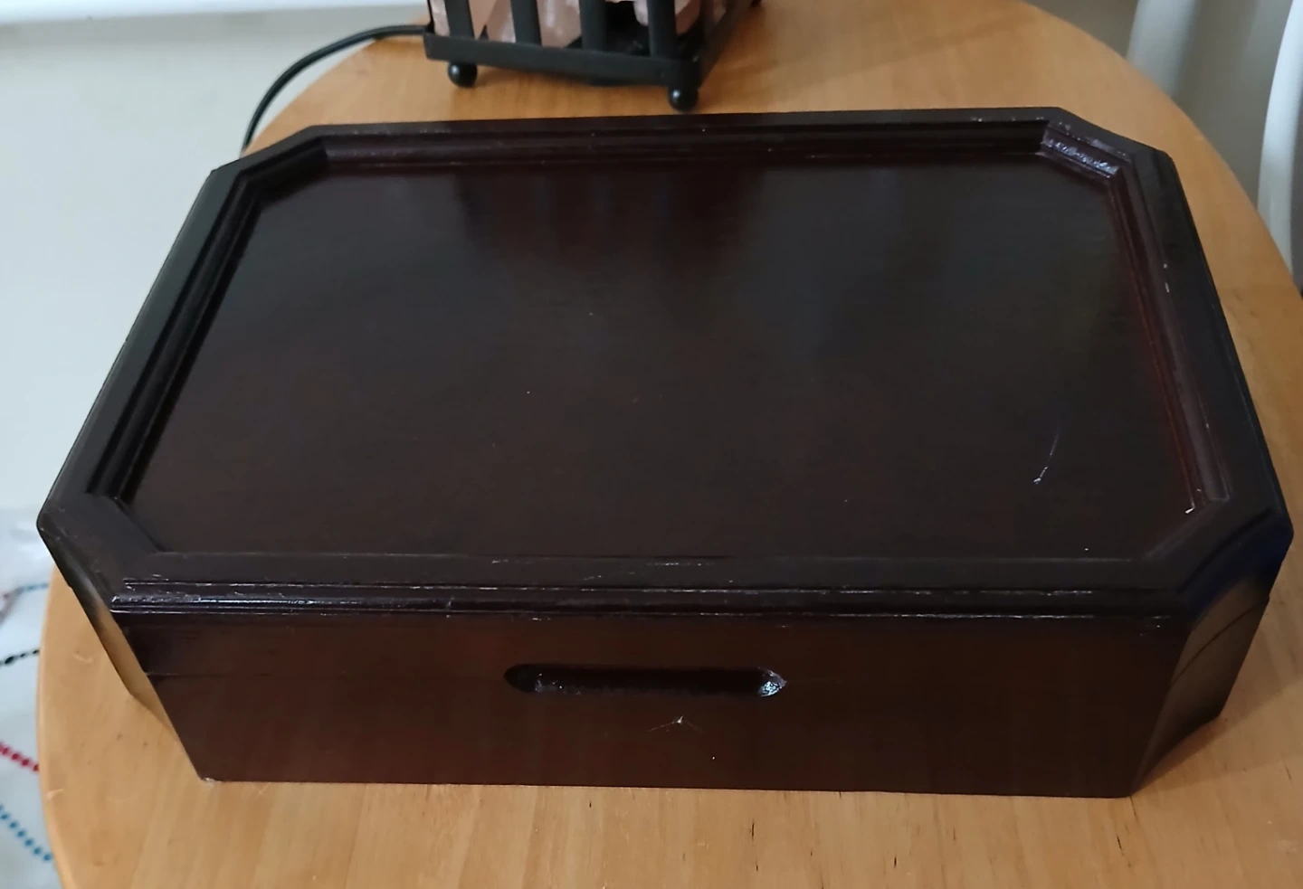 This is a lovely wooden jewellery box. It has a dark wood finish with a red velvet lining. Plenty of compartments for organizing rings, necklaces, and other accessories. The lid also has hooks for hanging necklaces or bracelets!