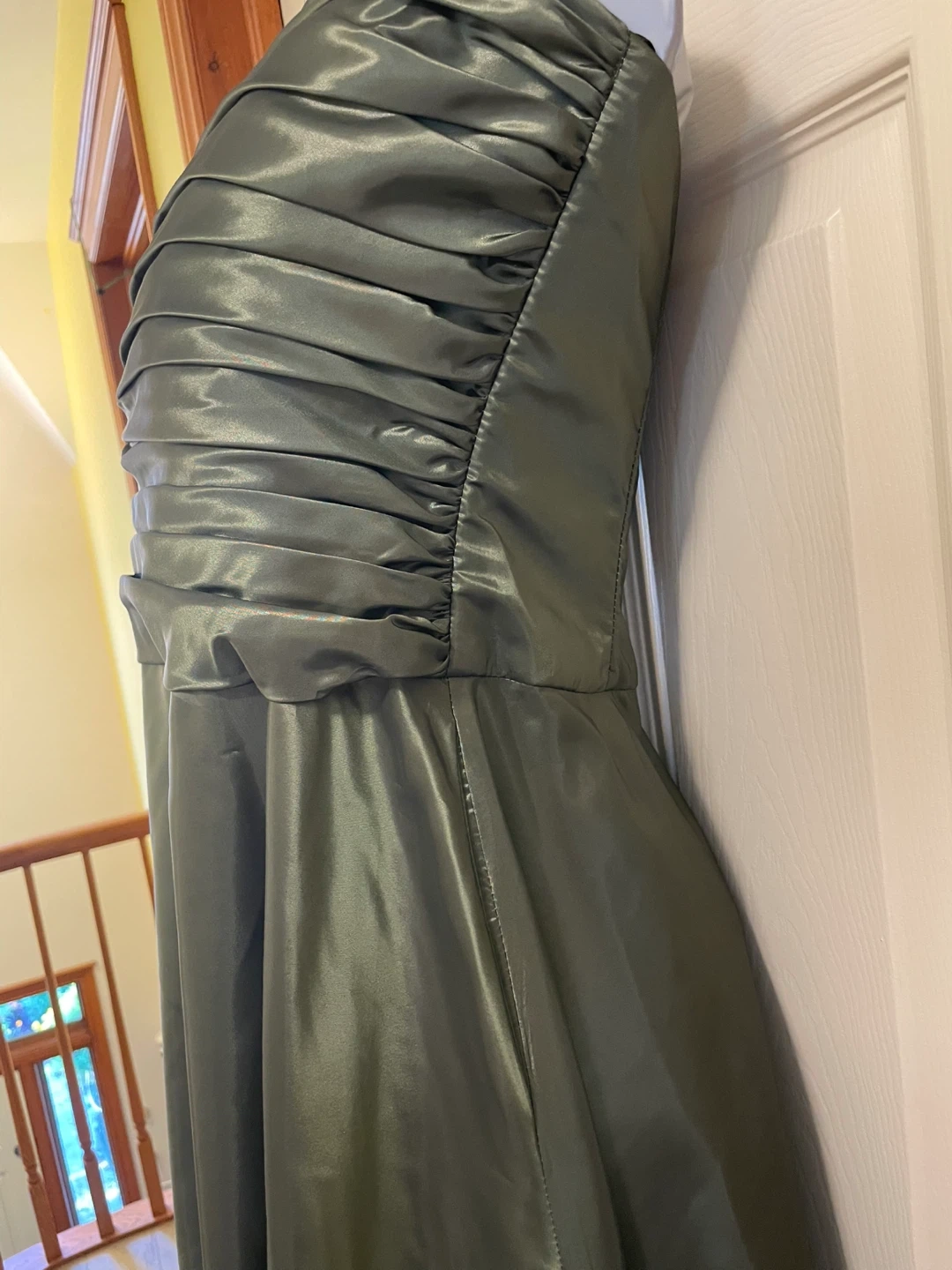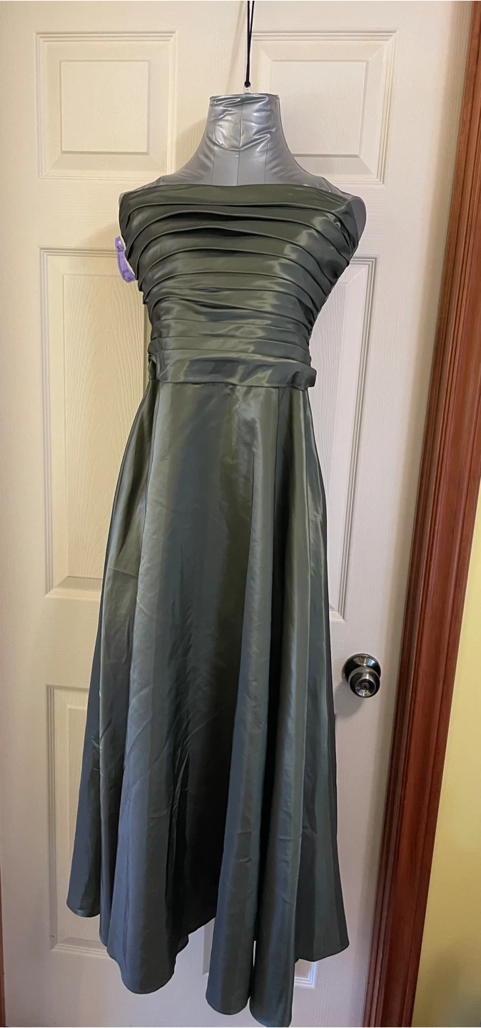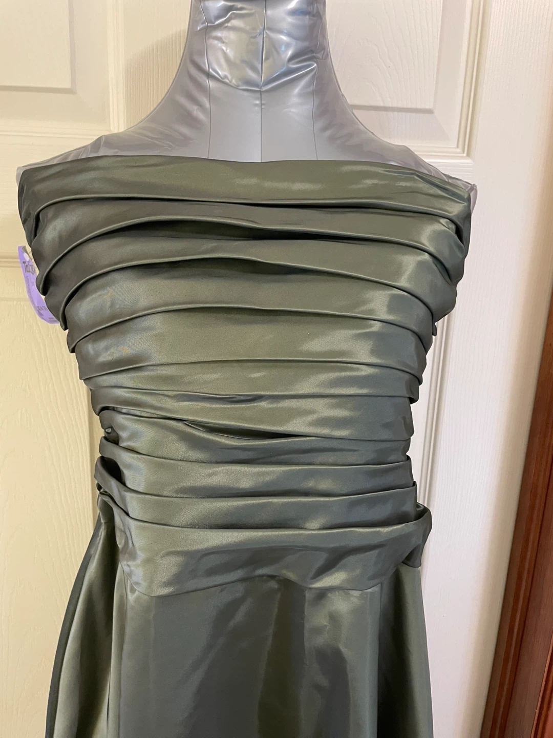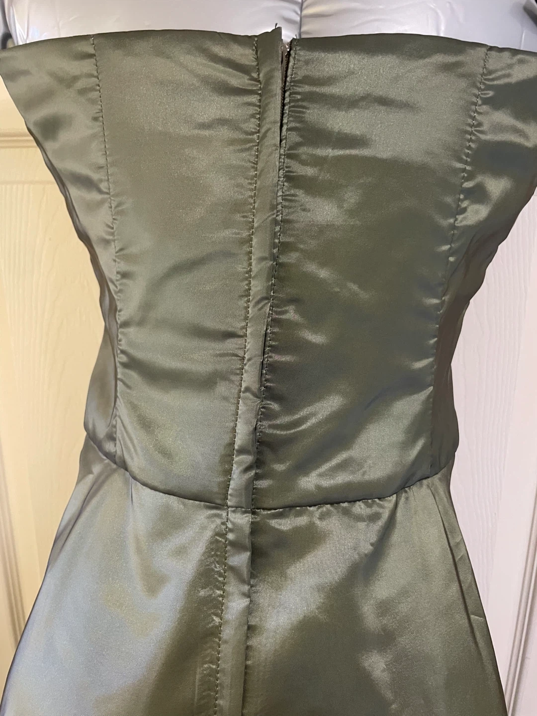 Chic strapless dress with a shiny finish. Perfect for elegant events (ie prom or bridesmaid dress)