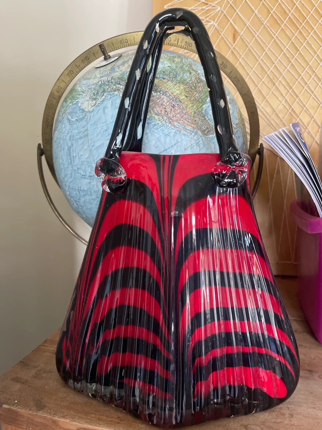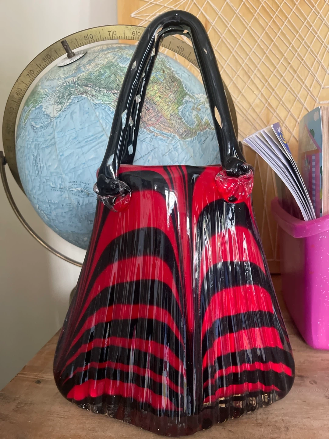 A striking glass purse with a red and black swirl pattern. Its unique design makes it a perfect decorative accent piece for any shelf or table. The handles are black glass.