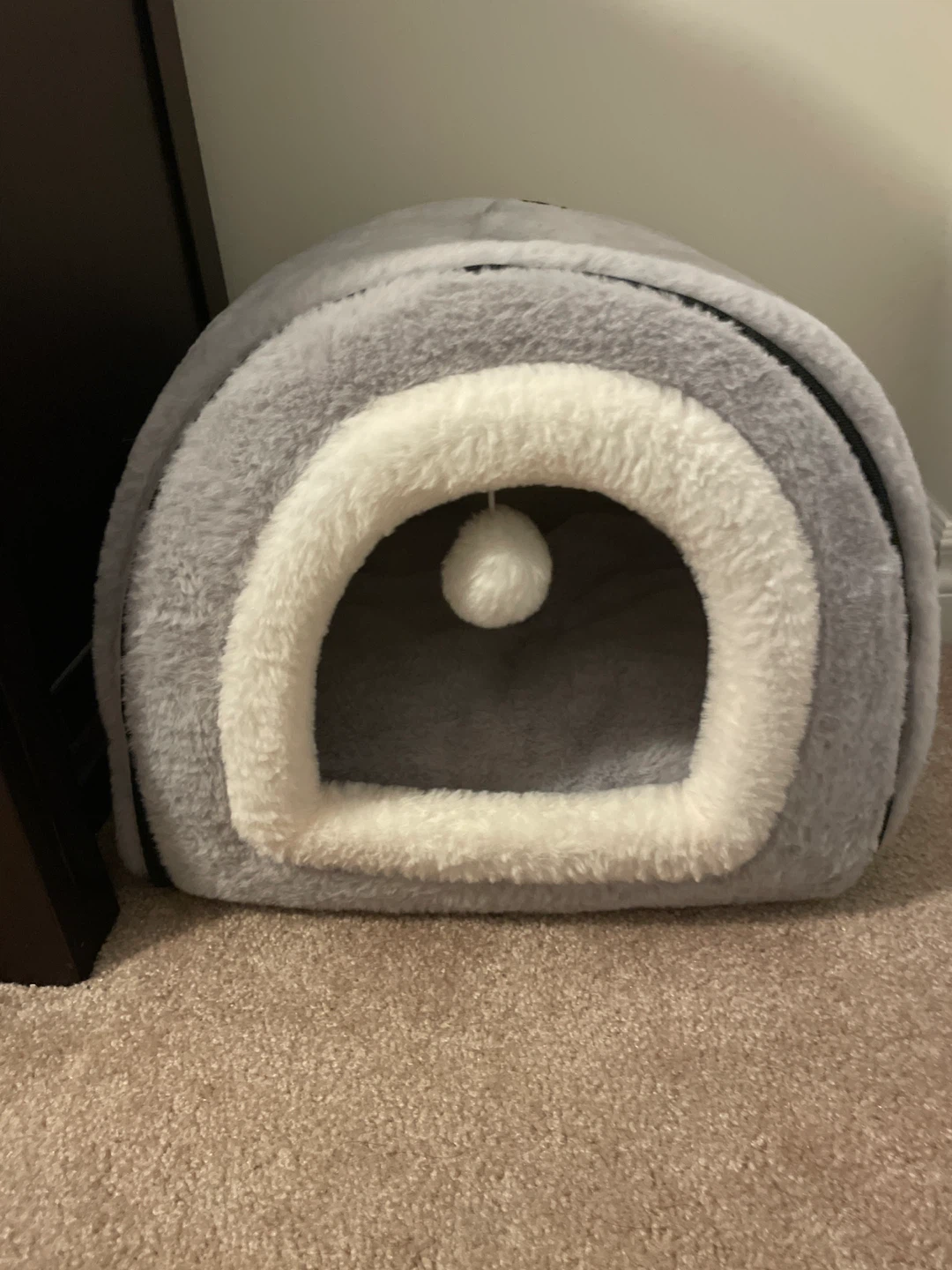 Soft grey and white plush pet bed. It has a fuzzy pom-pom inside for extra fun. Cozy and warm for small pets. Perfect for cats or small dogs to snuggle up in!