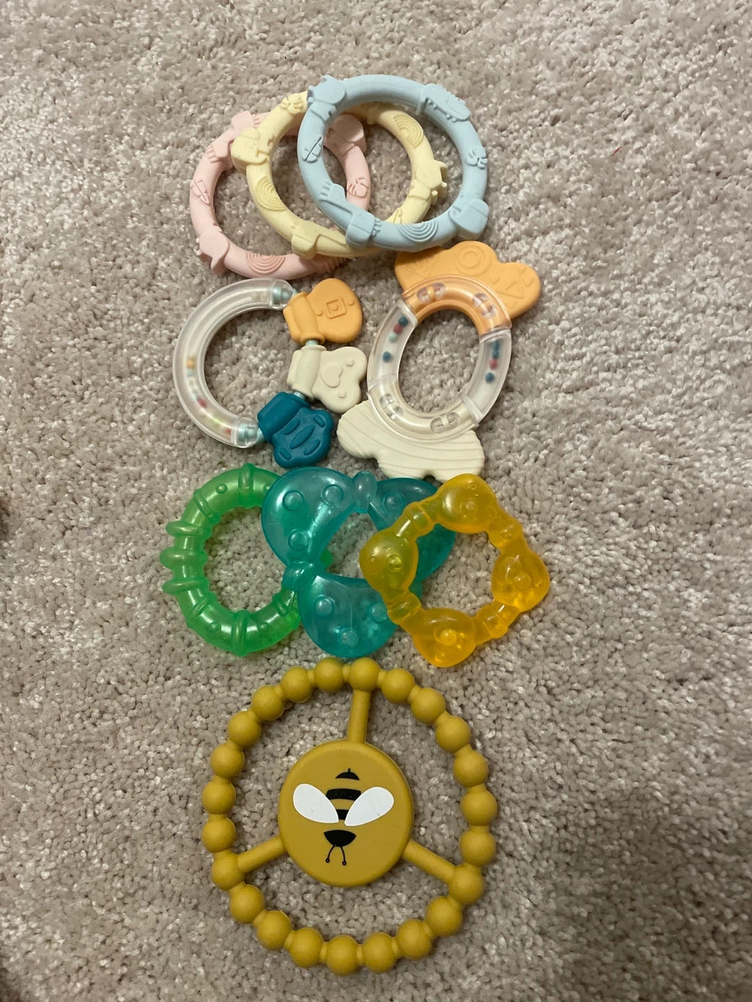 A collection of baby teethers in various shapes and colours. Includes a yellow bee-shaped teether, clear teethers with beads, and pastel-coloured ring teethers. Made from safe, chewable materials for little ones.