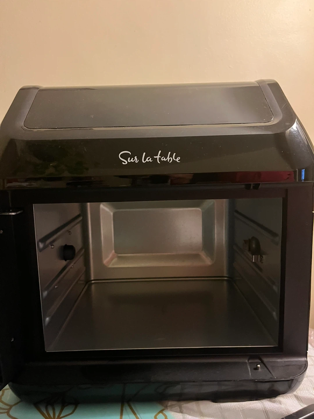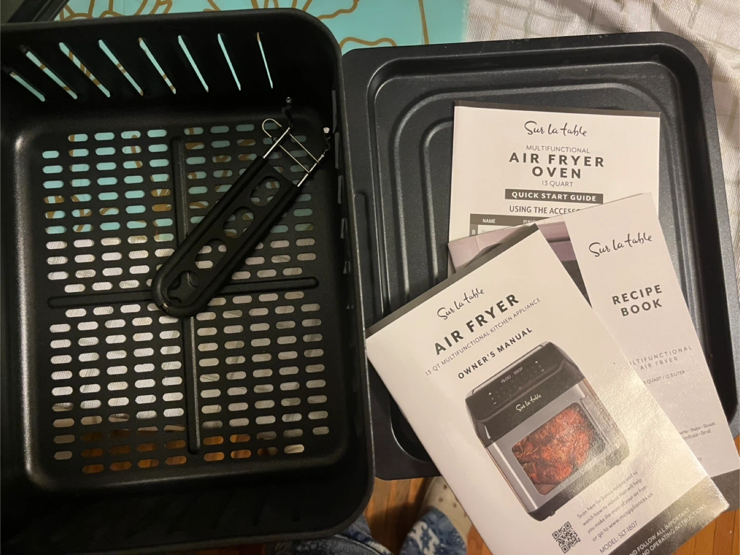 This Sur la table air fryer oven is 13 quarts. It's a multifunctional kitchen appliance. Includes owner's manual and recipe book.