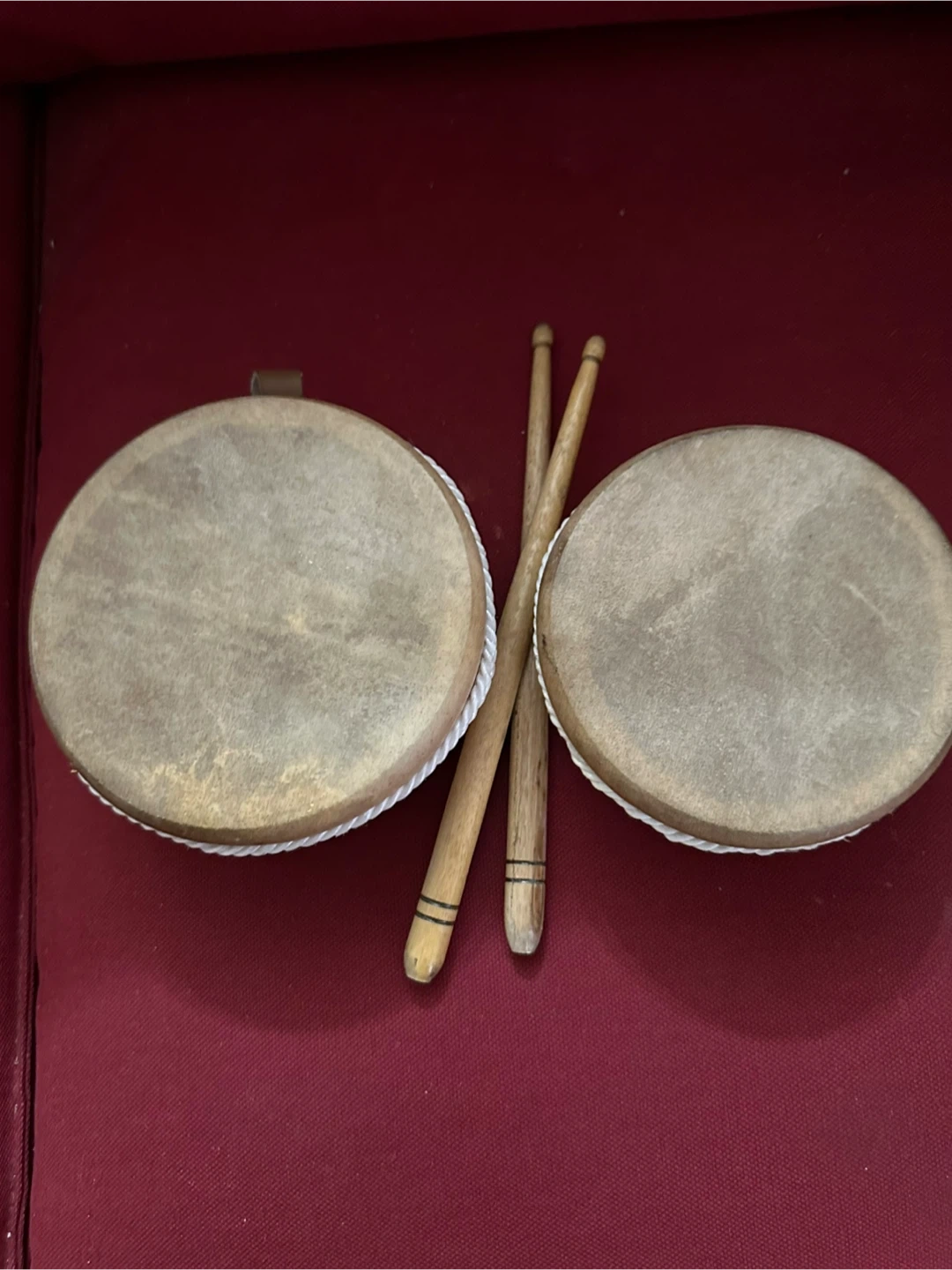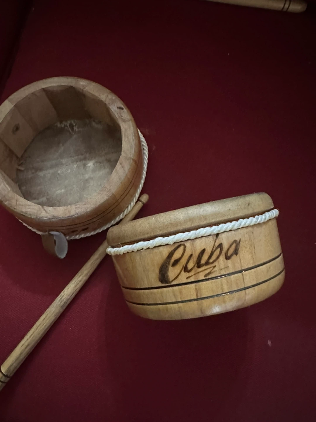 Small wooden bongos with "Cuba" branding. Includes two wooden drumsticks. Made with natural wood and drum skin heads. These hand drums are perfect for a beginner musician or for decorative display!