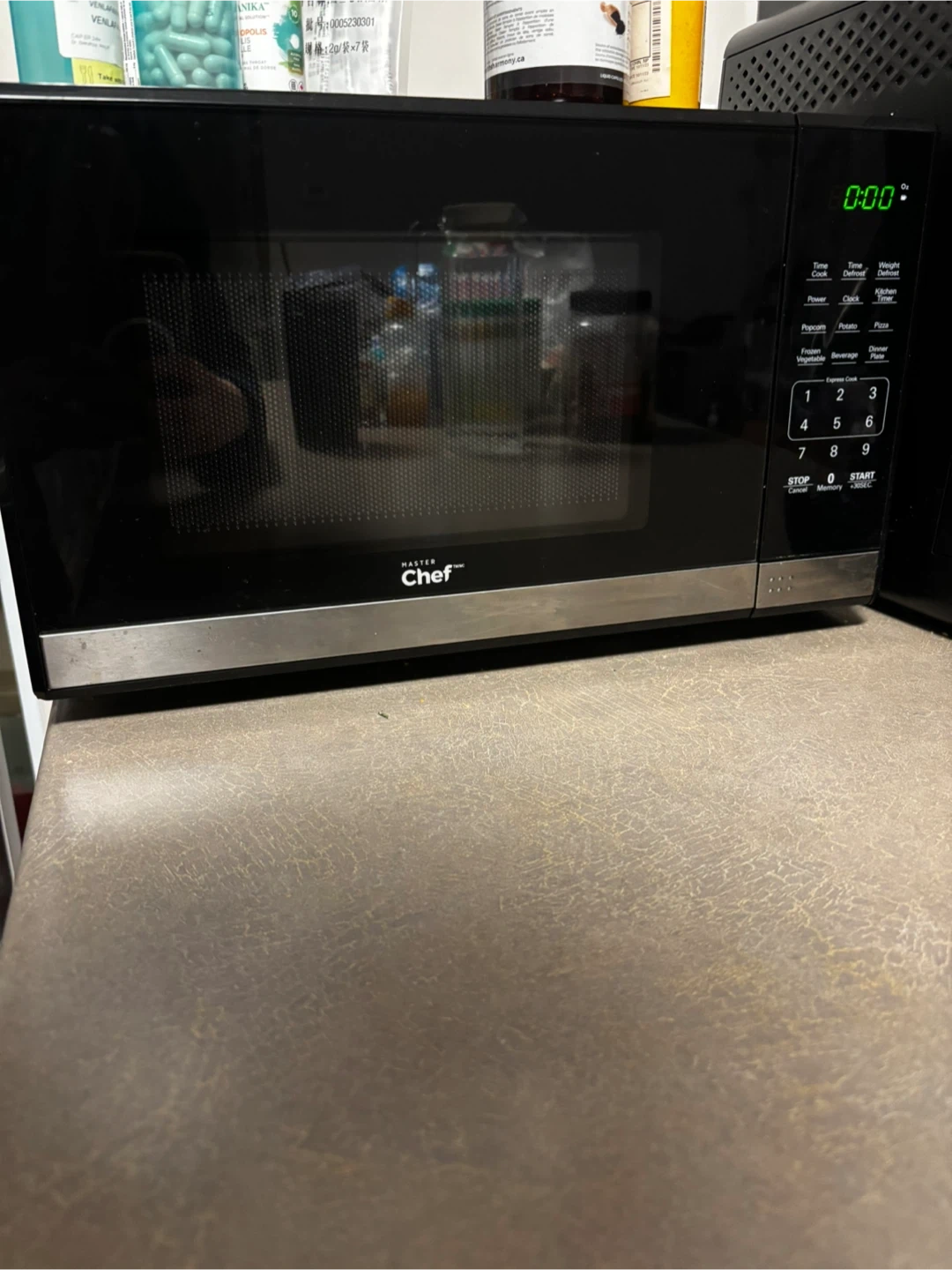Black Master Chef microwave oven with a digital display and various cooking presets.