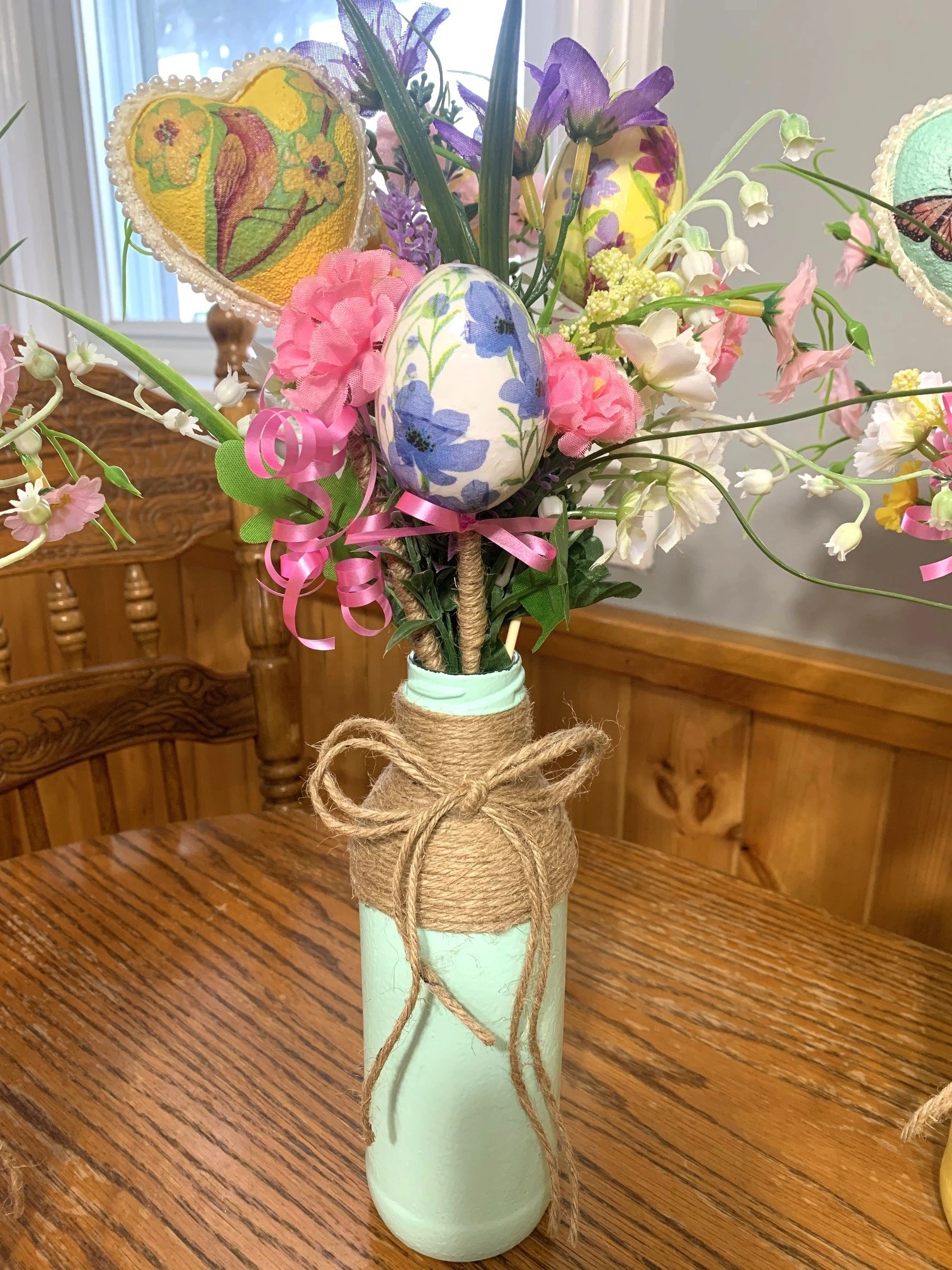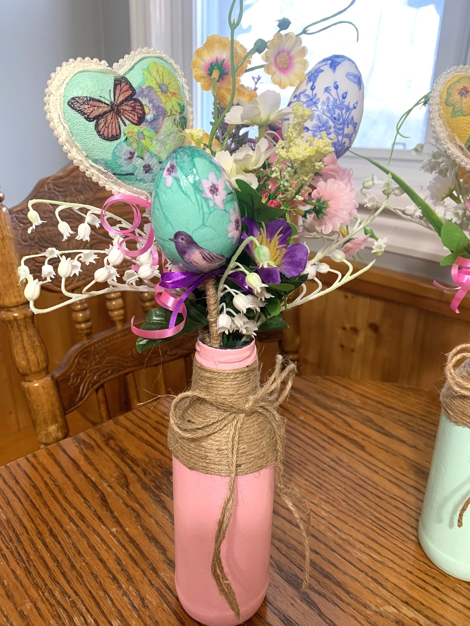 Our upcycled hand-painted glass decorative floral arrangements bring vibrant blooms into your space just in time for Easter brunch.