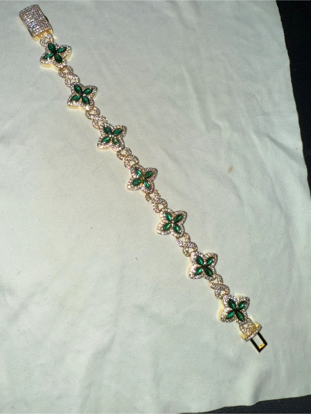 Gold-tone Clover Bracelet with Green Gems and Crystals