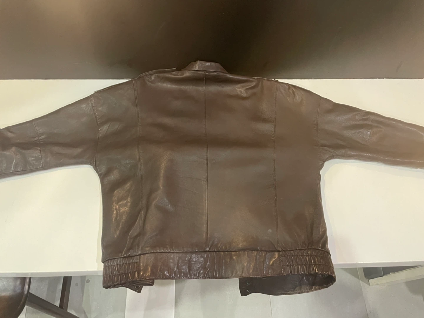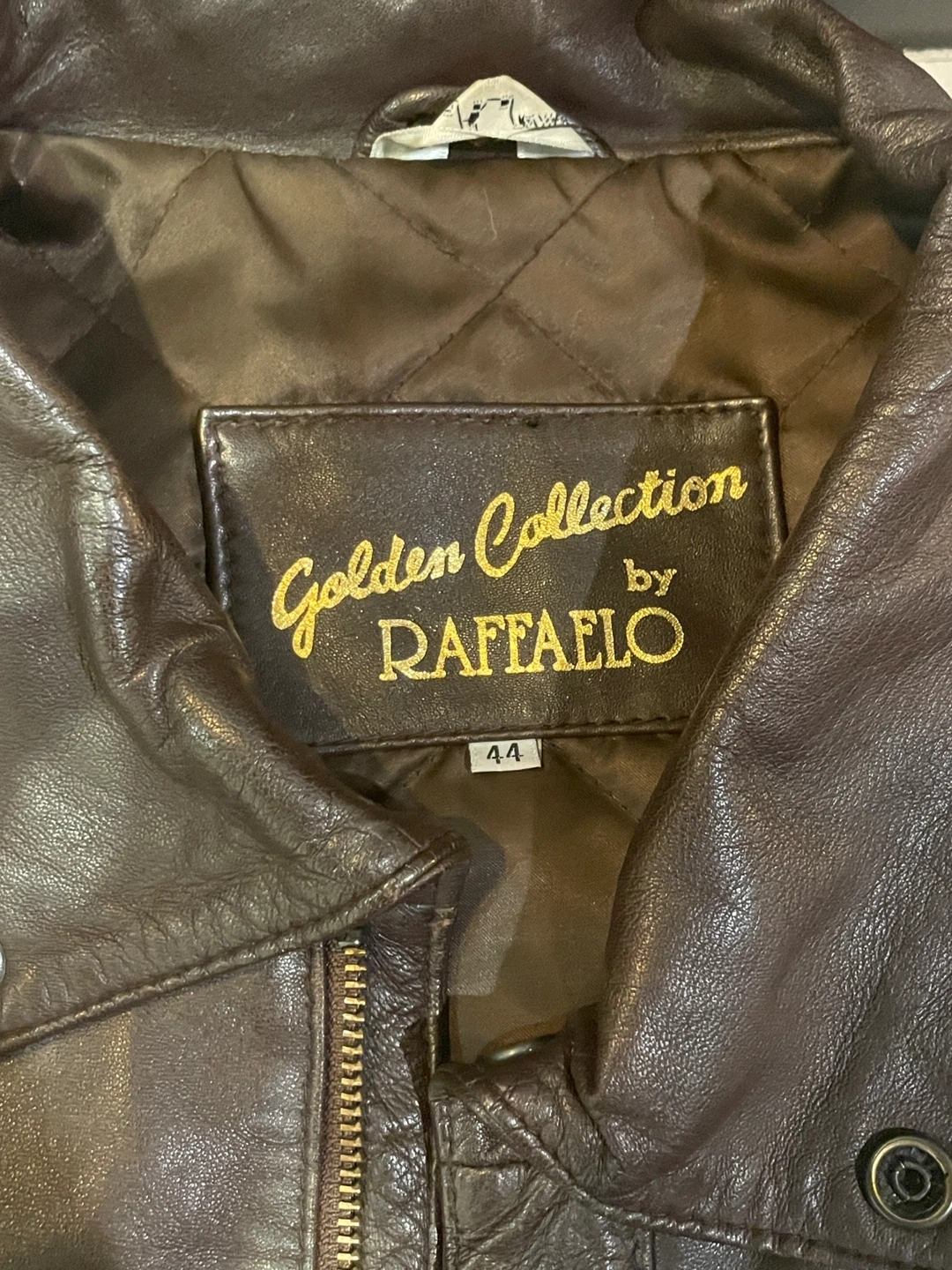This is a brown leather jacket from Raffaello's Golden Collection. It features a quilted interior lining and a classic bomber style with elasticated cuffs and waistband. The jacket has a zip-up front closure and a collar with snap buttons.