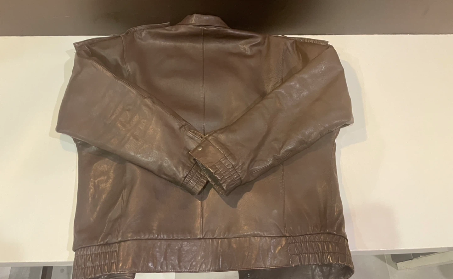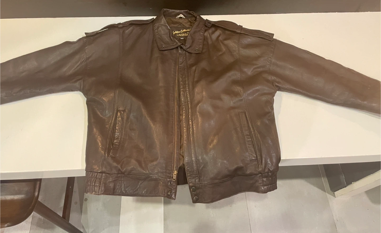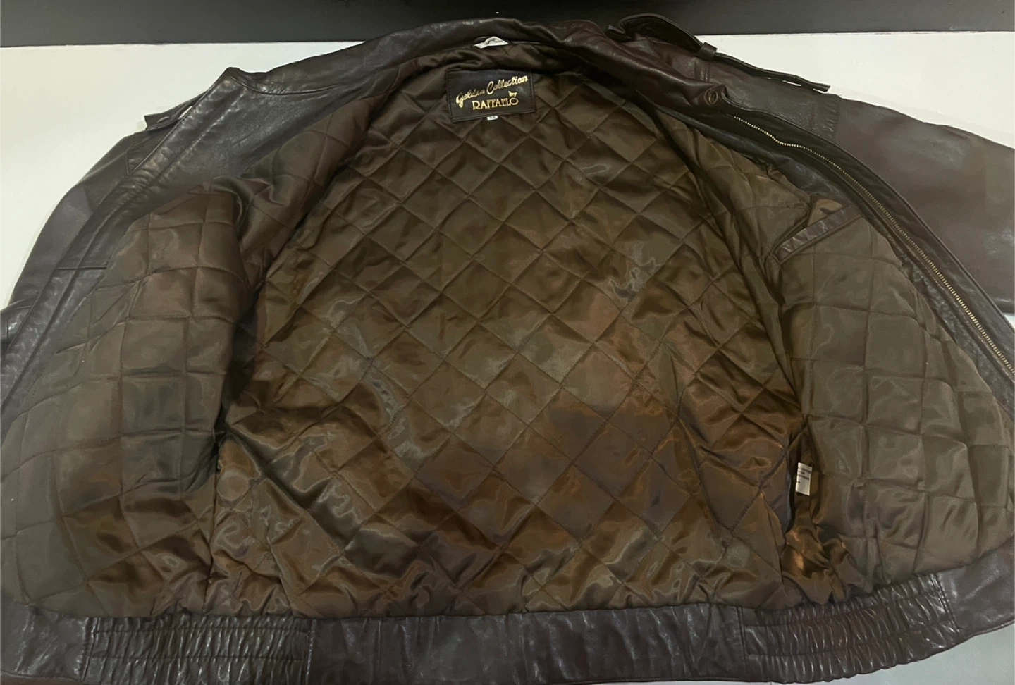 This is a brown leather jacket from Raffaello's Golden Collection. It features a quilted interior lining and a classic bomber style with elasticated cuffs and waistband. The jacket has a zip-up front closure and a collar with snap buttons.