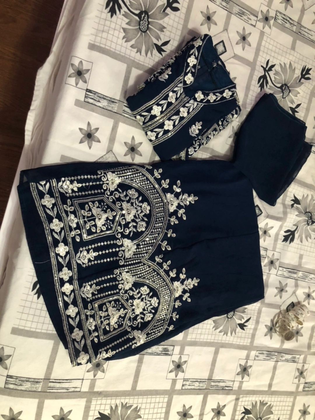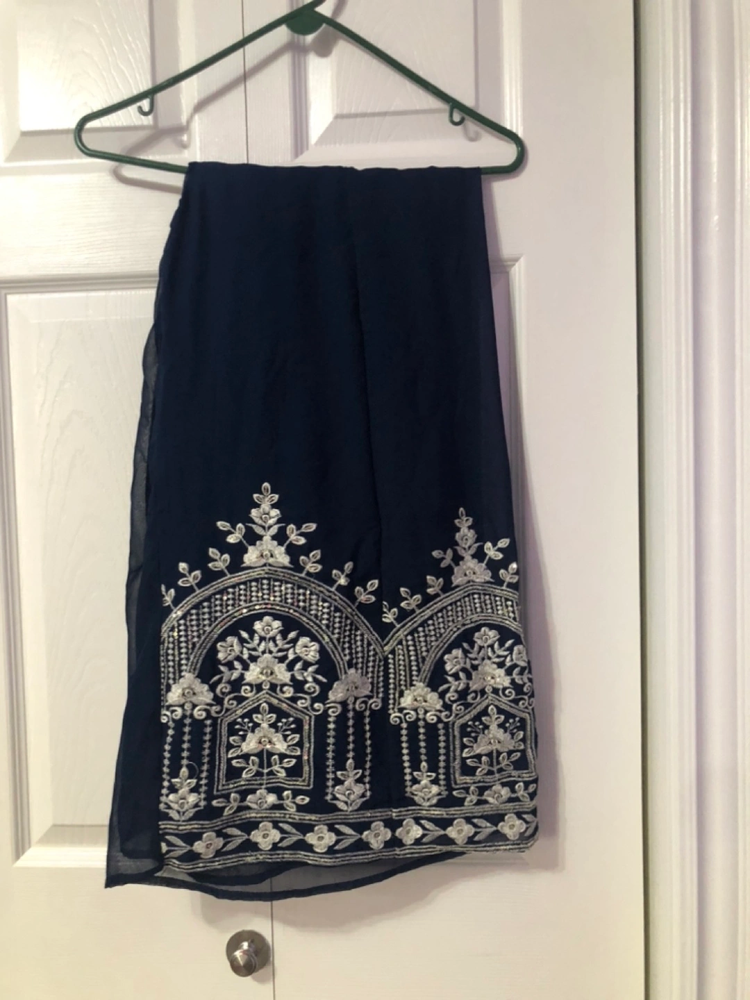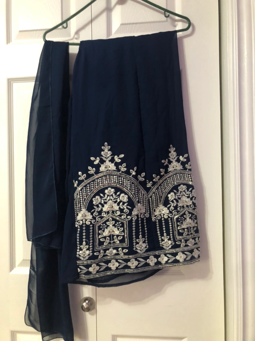 I am selling a beautiful girls' outfit. This outfit features a navy colour and intricate white embroidery. It is made up of a long top and a wide bottom, and also includes a scarf. With this outfit, your little one can feel confident and stylish.