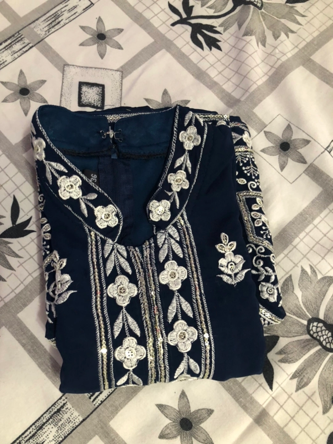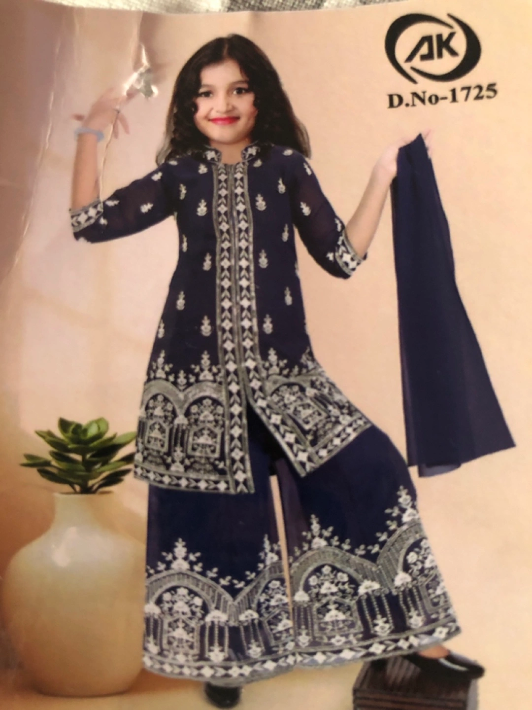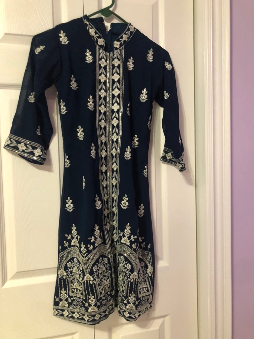 I am selling a beautiful girls' outfit. This outfit features a navy colour and intricate white embroidery. It is made up of a long top and a wide bottom, and also includes a scarf. With this outfit, your little one can feel confident and stylish.