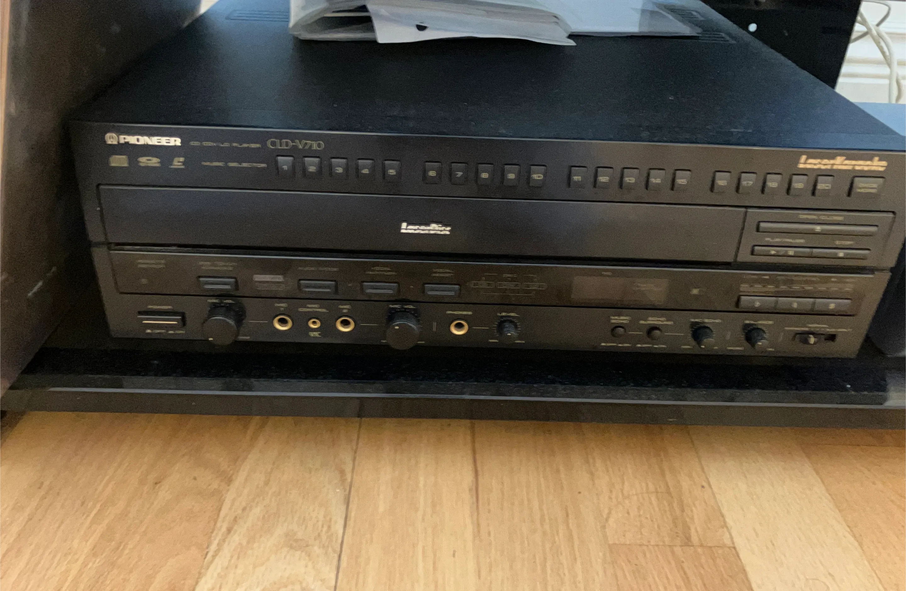 This is a Pioneer CLD-V710 LaserActive CD/LD Player. It supports CD and LD formats. The unit includes numerous controls and inputs for audio and microphone adjustments.