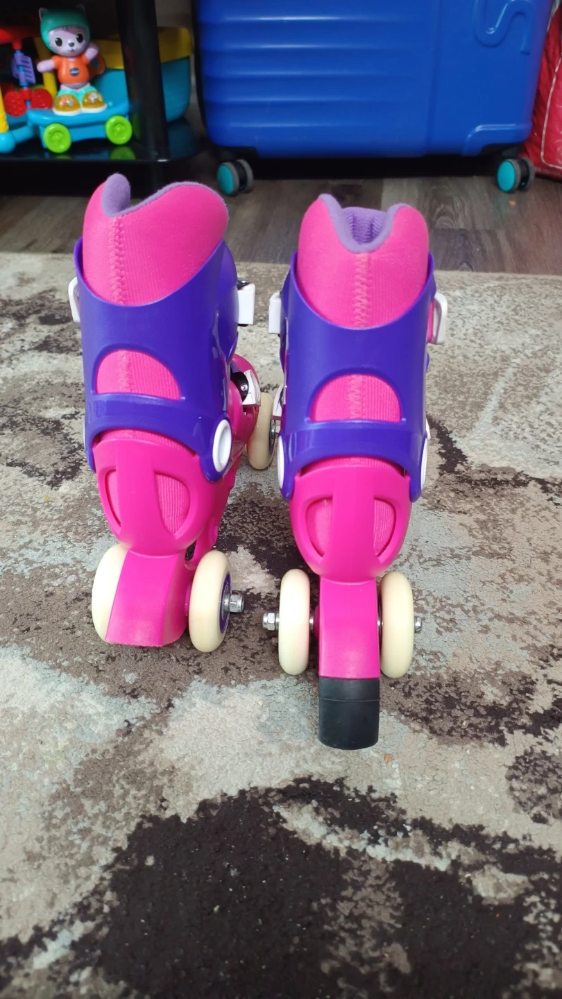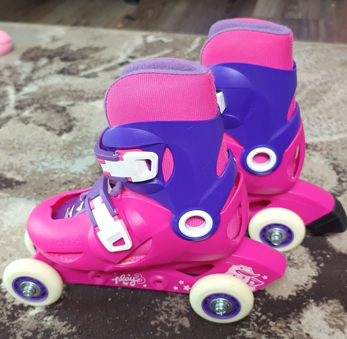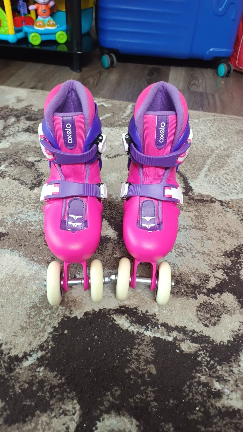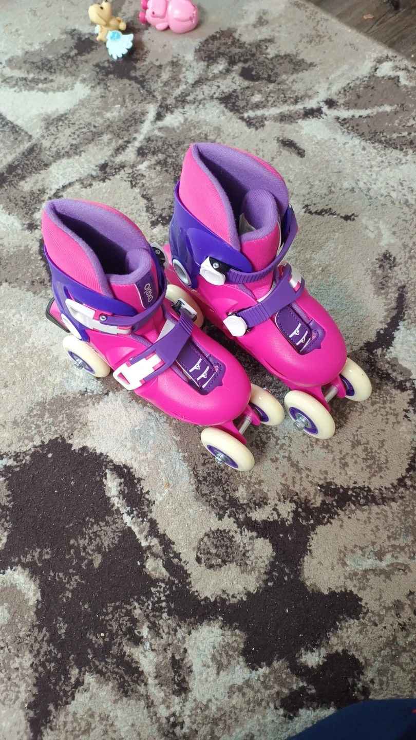These Oxelo roller skates come in a vibrant pink and purple colourway. They feature adjustable straps for a secure fit. Perfect for learning to skate!