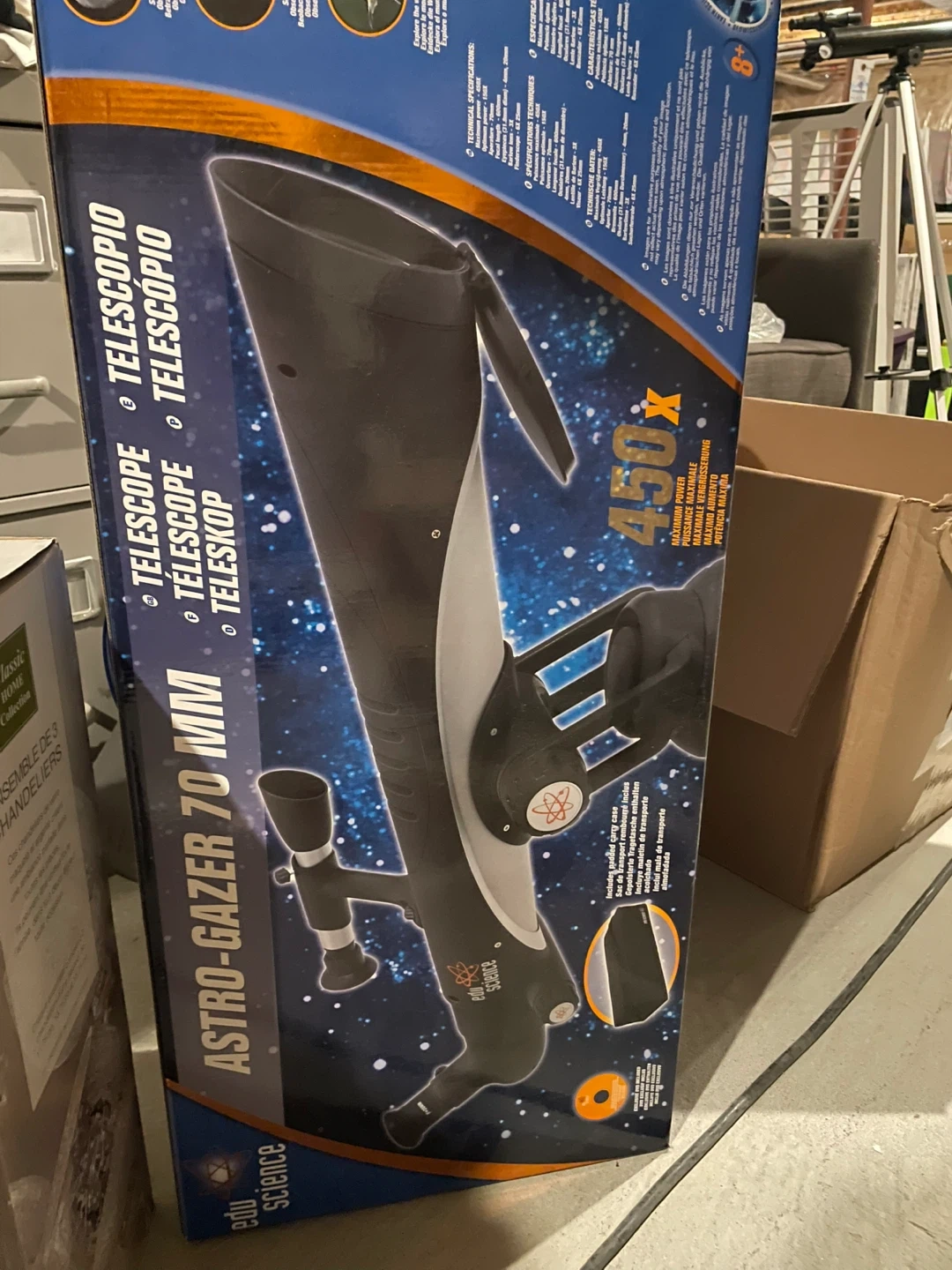 Selling an Astro-Gazer 70 mm telescope with 450x maximum power! It comes with a padded carry case, perfect for taking it on the go. The box is included as well, so it's easy to store when not in use