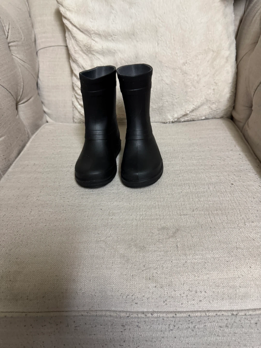 Selling a pair of kids' black rain boots in size 10. They are in great condition and ready for some puddle jumping!