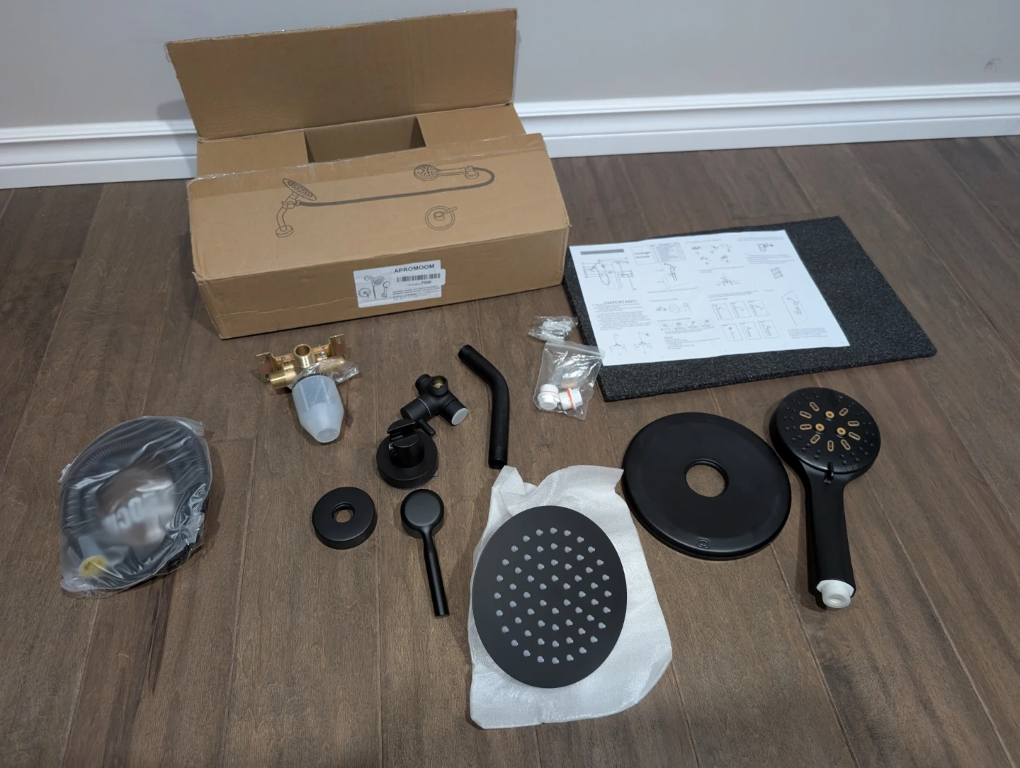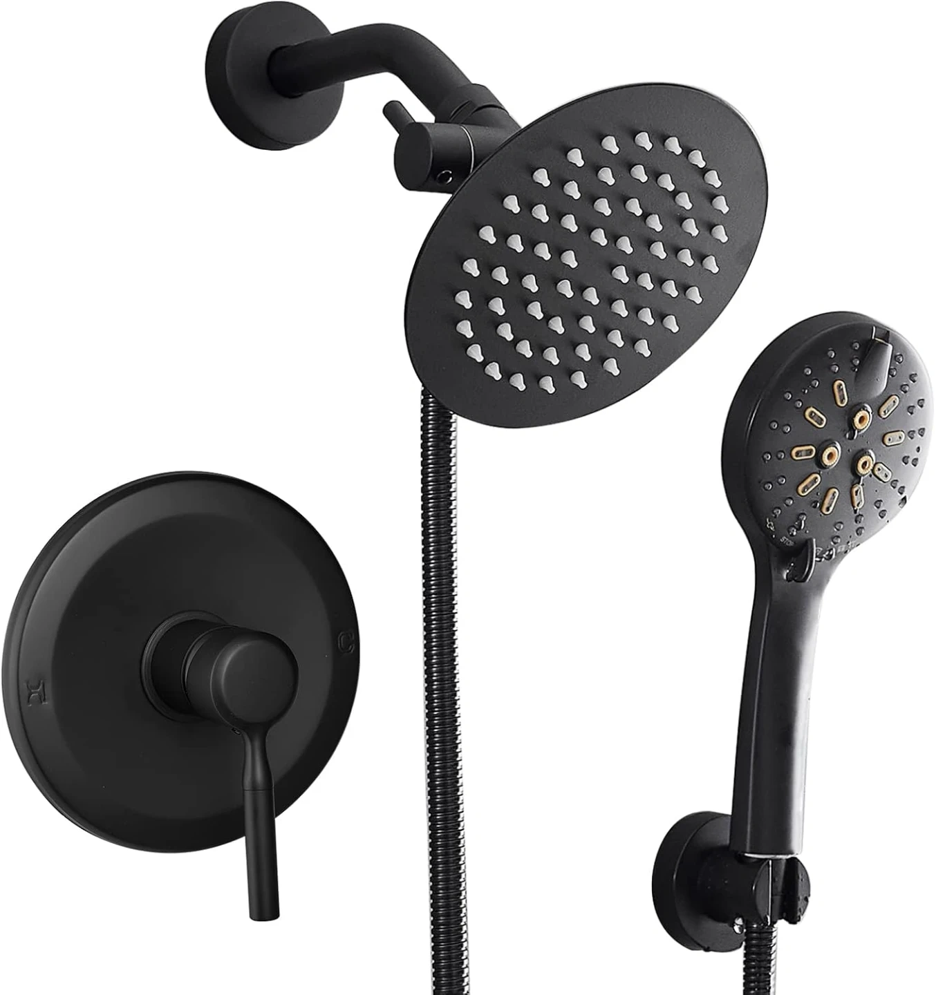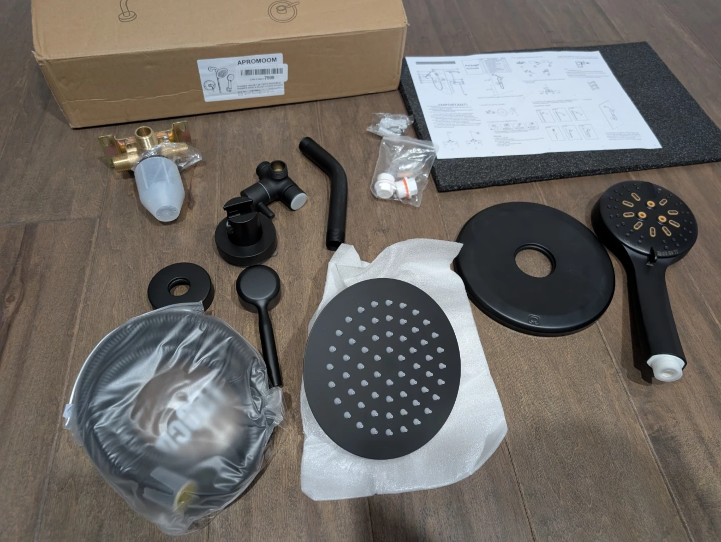 Brand new matte black round shower head faucet kit for sale. 6” inch rainfall showerhead, shower head arm, valve, handle trim kit, 6 spray setting hand shower wand, full kit with everything needed, $75 FIRM. Shower, Bathroom, Bath, Tub, Reno, Bathtub, Water, Tower, Massage, Rainfall, Waterfall, Jets, LED, Lights, Column, Valve, Wand, Spray, Renovation, Temperature, Pressure, Balanced, kit, system, trim
