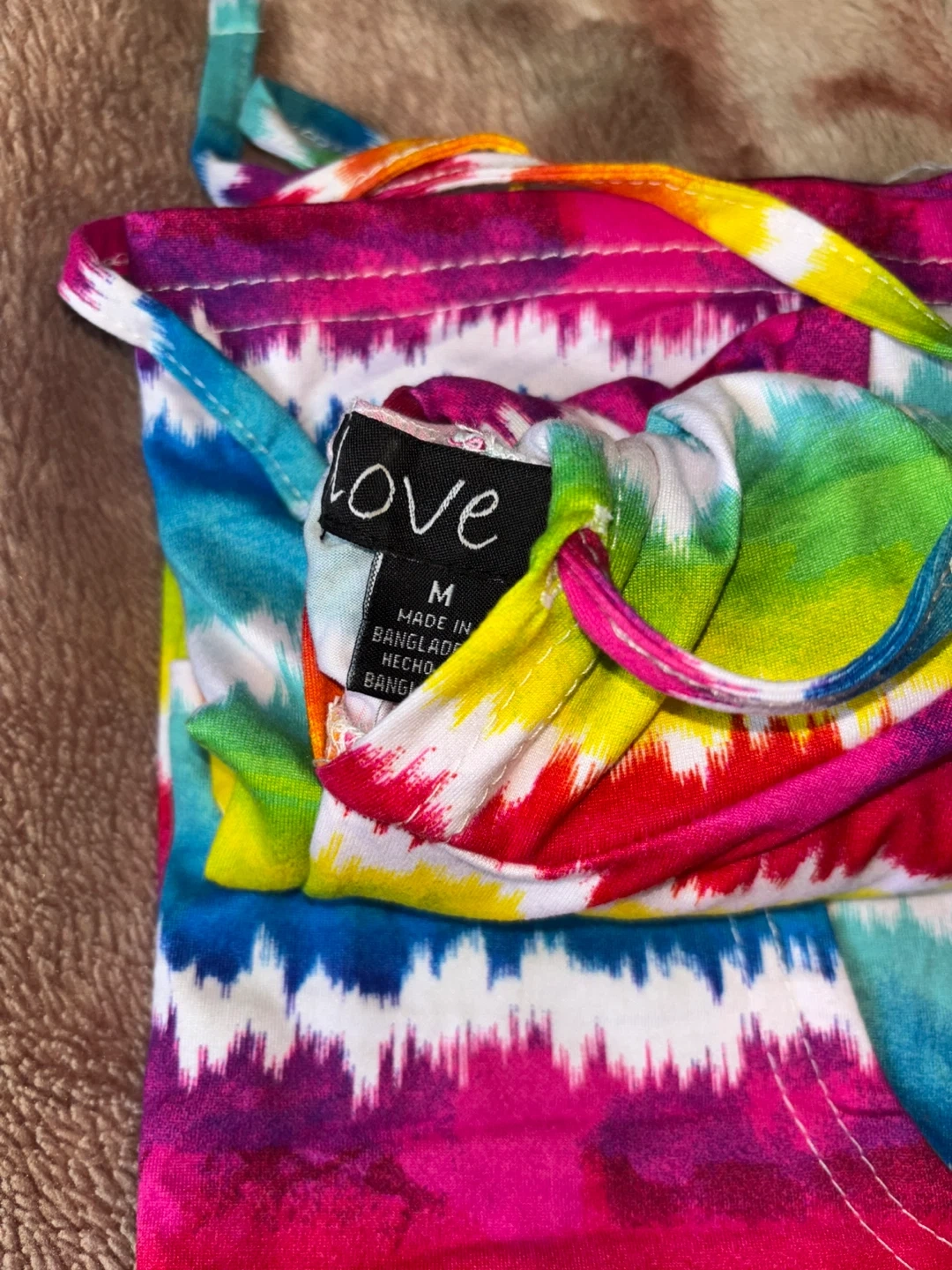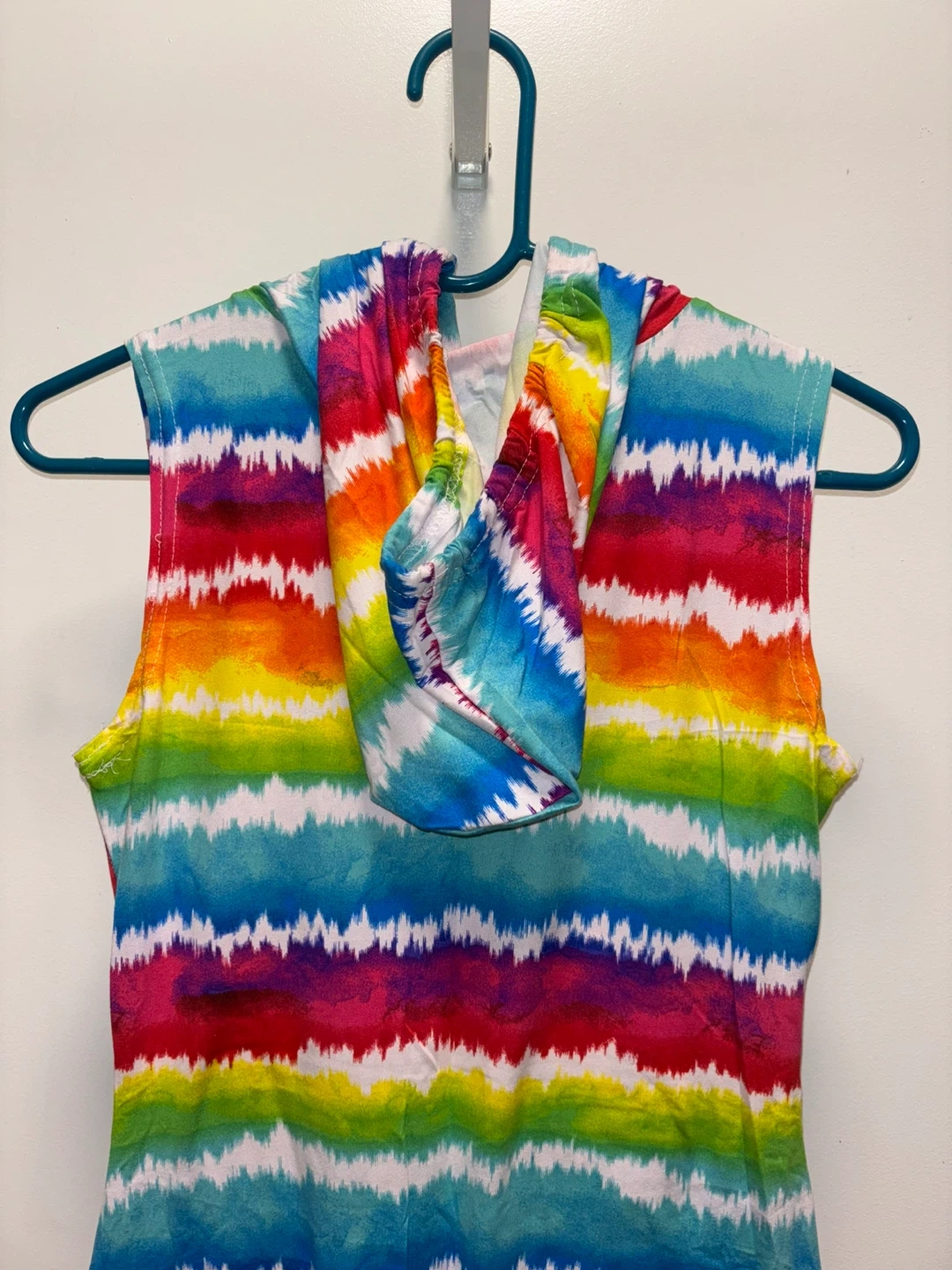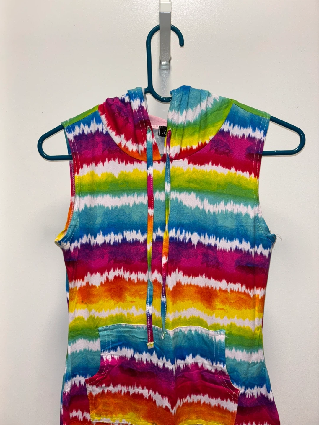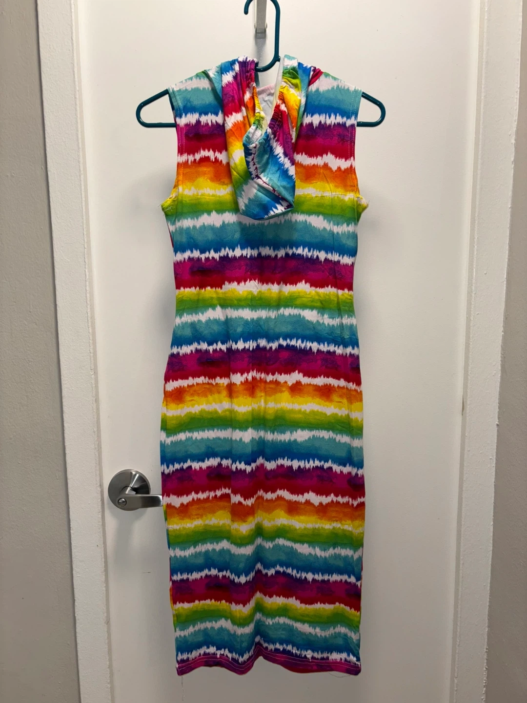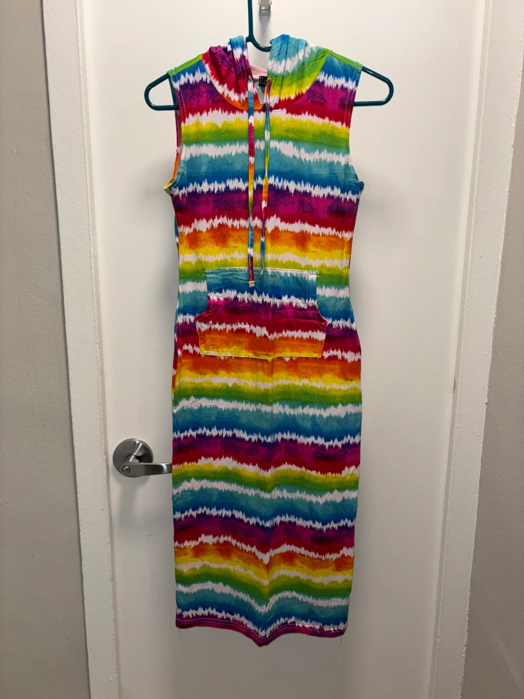 This LOVE brand dress features a vibrant tie-dye pattern in rainbow colors. It's a sleeveless style with a hood and a front pocket. Made in Bangladesh, size M. Brand new.