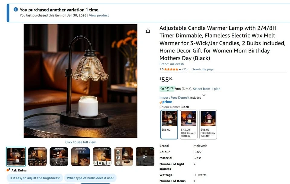 Candle Warmer Lamp with Timer – Dimmable, Flameless, Black