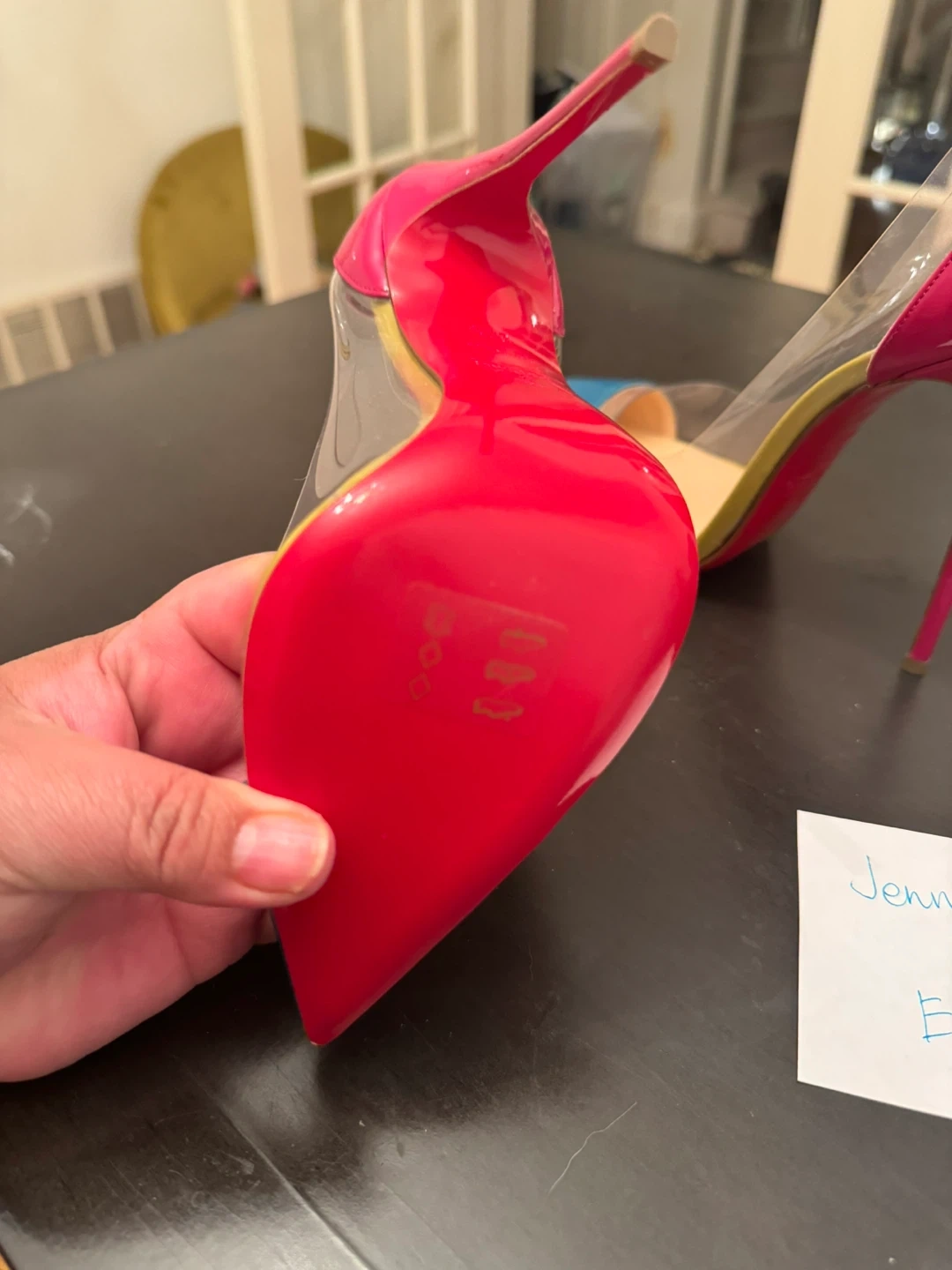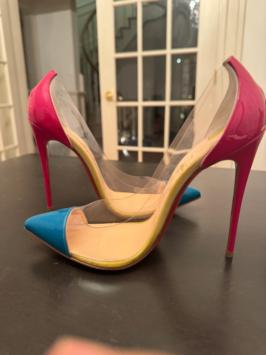 These statement heels feature a vibrant pink and blue patent leather toe cap with clear PVC sides. The iconic red sole is a signature detail. They're a size 37.5.