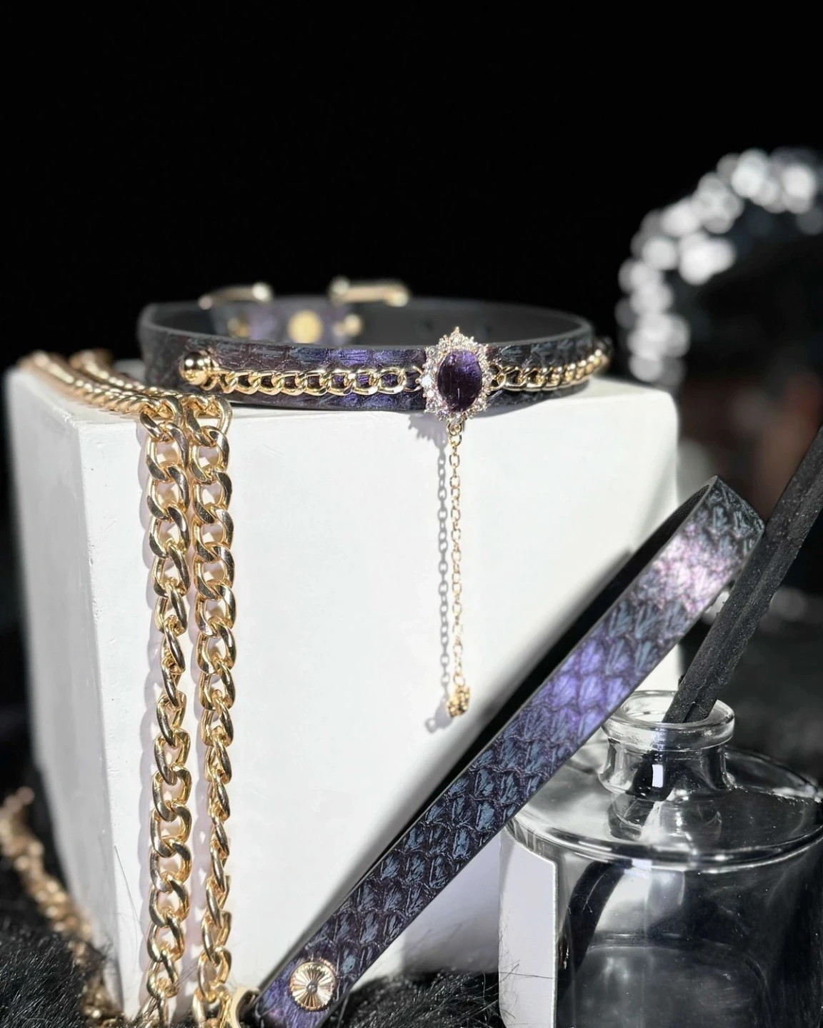 This stylish set includes a choker and a matching leash. It features gold-tone chains and a prominent purple gem on the choker, accented with clear rhinestones. The leash also has gold-tone chain details.