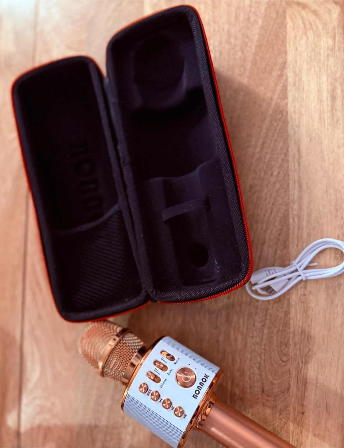 This is a Bonok brand portable karaoke microphone. It's rose gold and white and comes with its original protective case. A charging cable is also included. Great for parties or practising your tunes! Comes with a case as well!