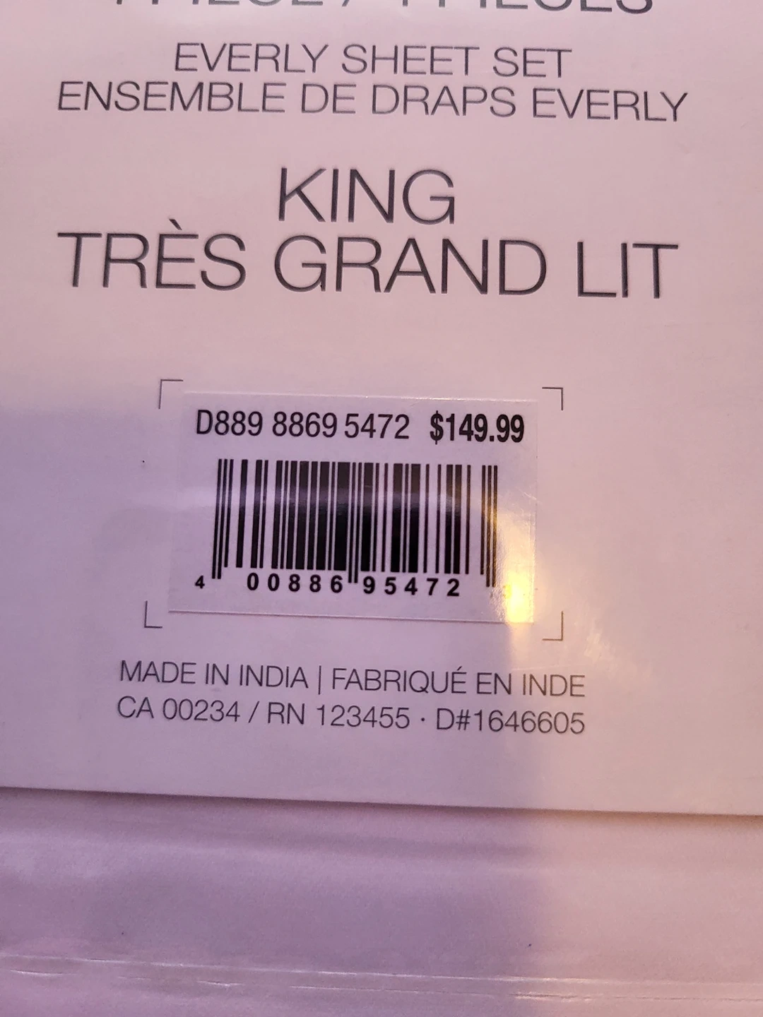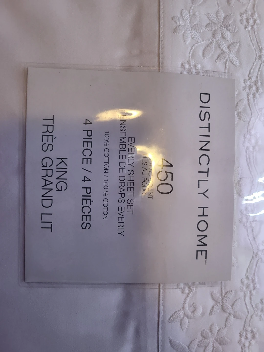Brand New Set of Kingsize sheets. Regularly sold for $149.99, I paid $50 on clearance. It's been in storage. I have a double bed now. Smoke-free, Cat Friendly home. As is. 2 pillow cases, one flat sheet, and one fitted sheet. Embroidered Hem. 450 thread count, 100% cotton, Fits mattresses up to 41 cm (16 in) deep.