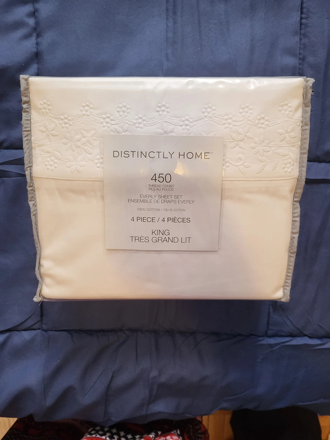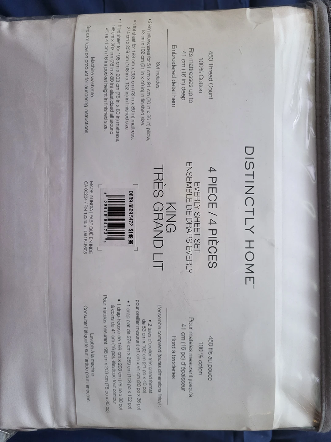 Brand New Set of Kingsize sheets. Regularly sold for $149.99, I paid $50 on clearance. It's been in storage. I have a double bed now. Smoke-free, Cat Friendly home. As is. 2 pillow cases, one flat sheet, and one fitted sheet. Embroidered Hem. 450 thread count, 100% cotton, Fits mattresses up to 41 cm (16 in) deep.