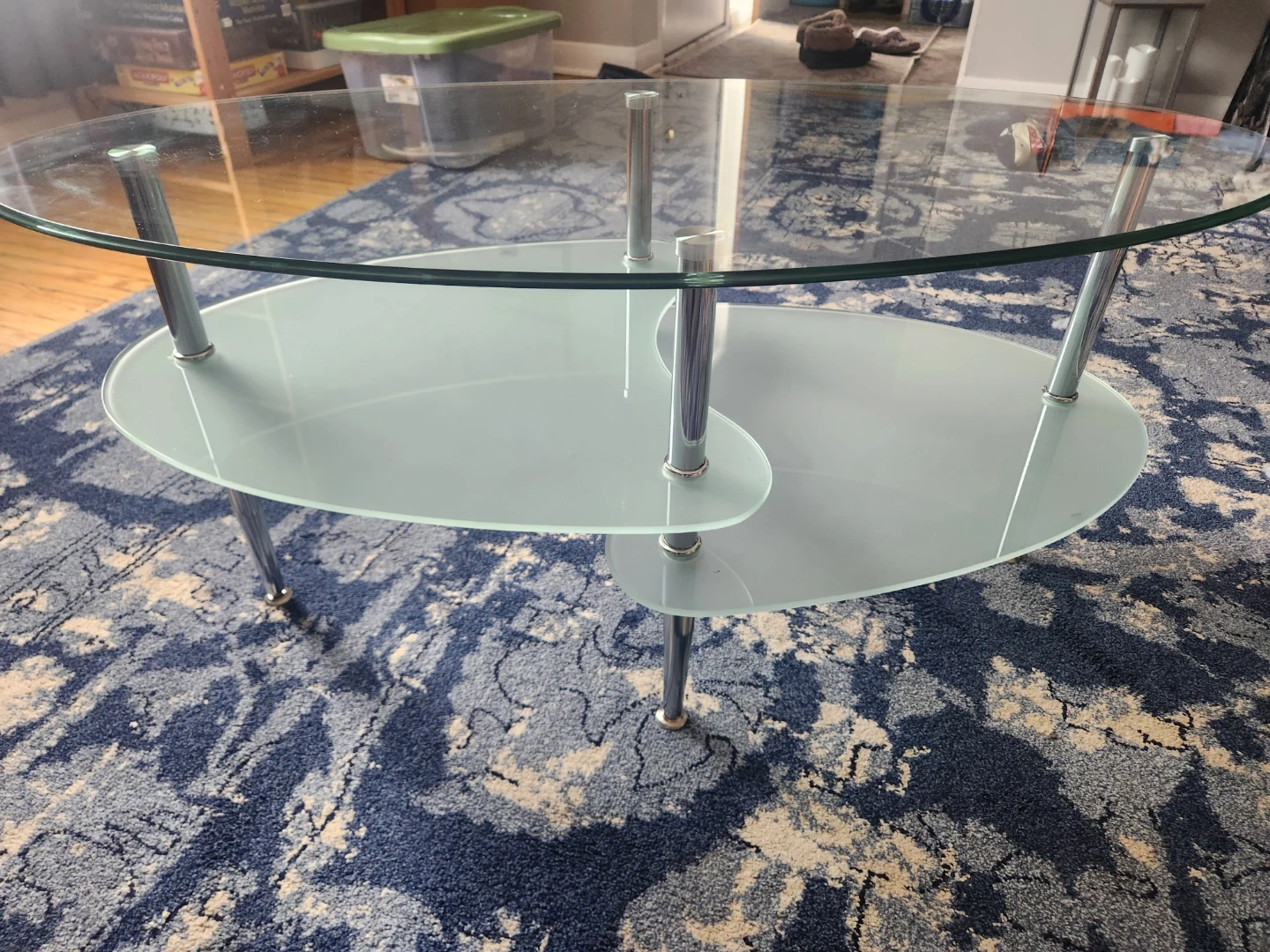 A two-tiered oval coffee table with a clear glass top and a frosted glass shelf. It features sleek chrome metal legs and supports. It's a stylish piece for any living room!