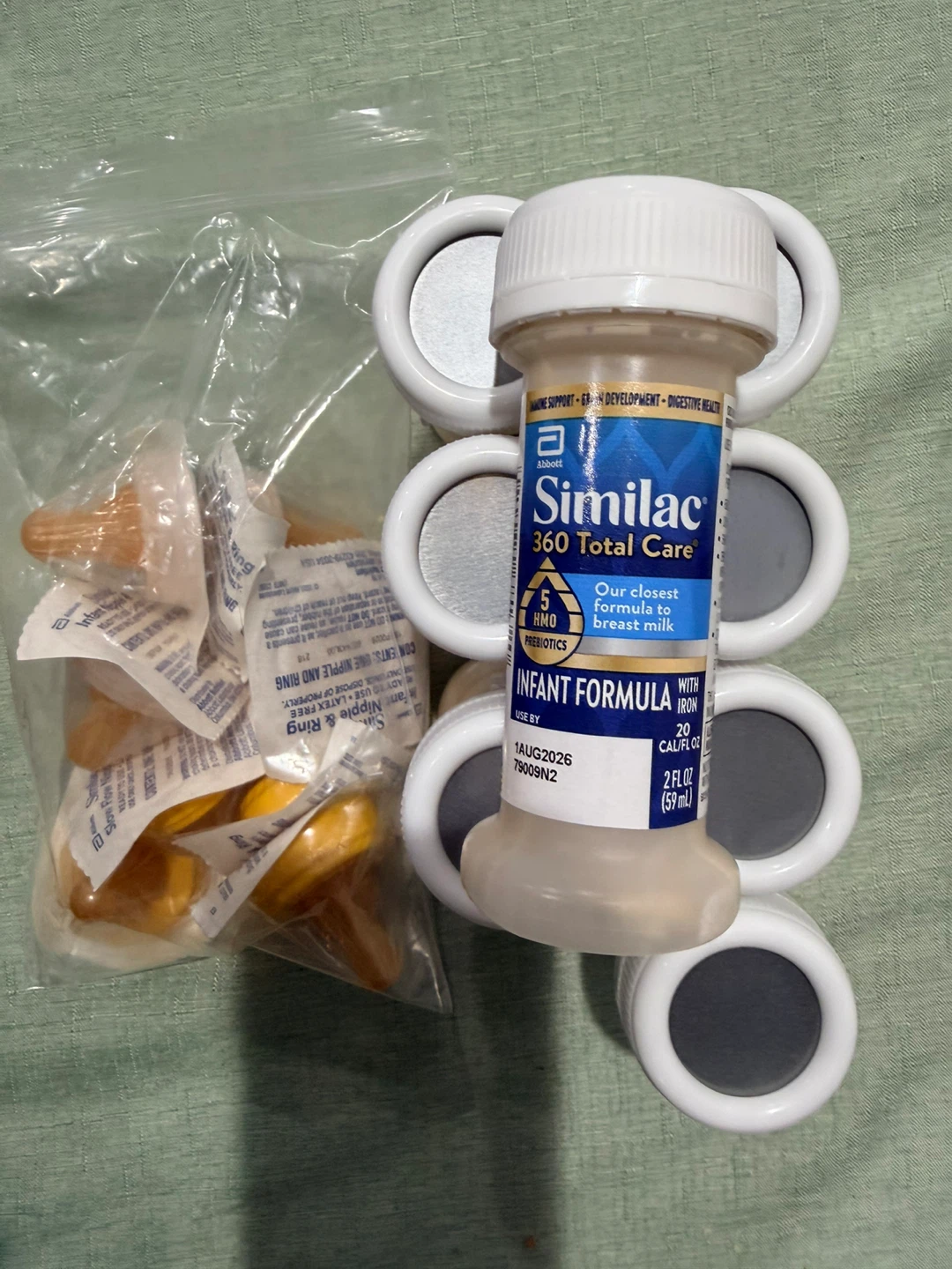 Eight 2 oz bottles of Similac 360 Total Care infant formula. Includes a bag of Slow Flow nipples. Formula expires 08/01/2026.