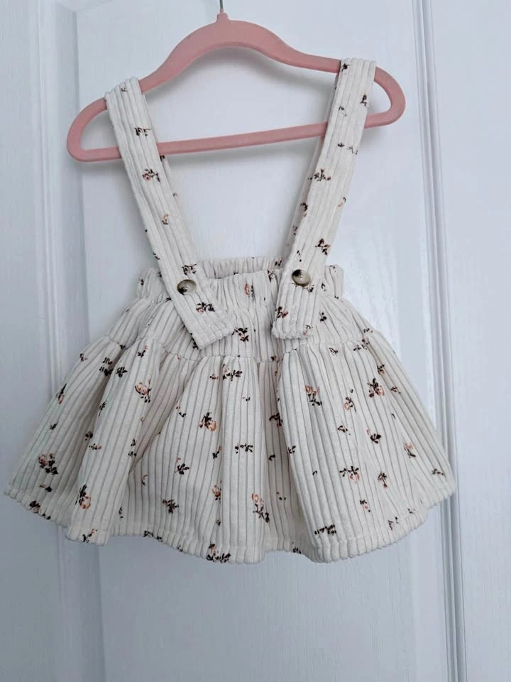 Adorable corduroy suspender skirt with a soft cream base and delicate floral print. Pick up near Yonge and Hillcrest.