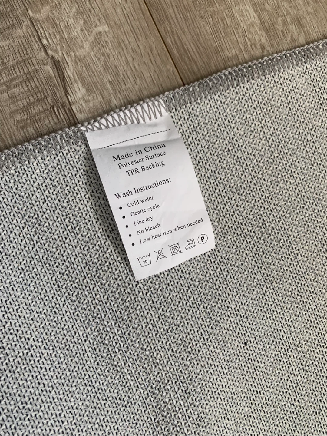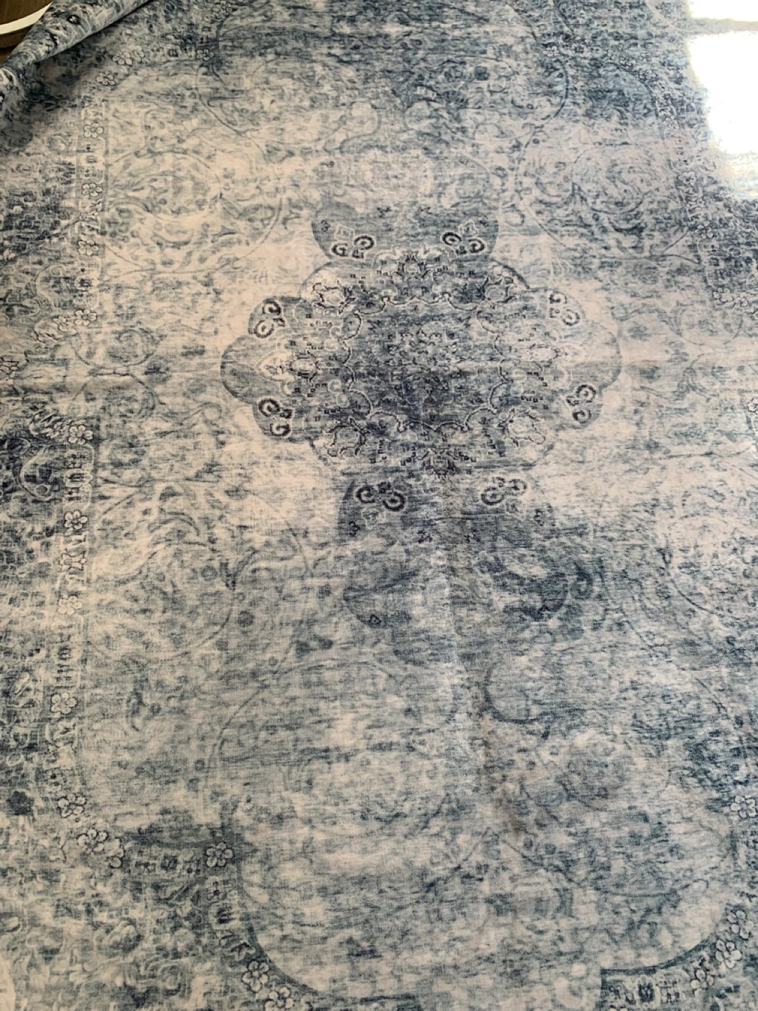 Selling a brand new area rug with a beautiful blue pattern! It's made with a polyester surface and TPR backing. For cleaning, it's recommended to wash in cold water on a gentle cycle, line dry, and use low heat iron when needed