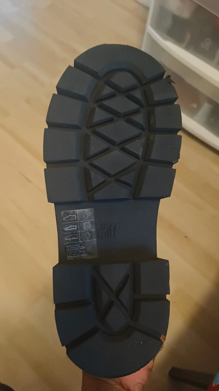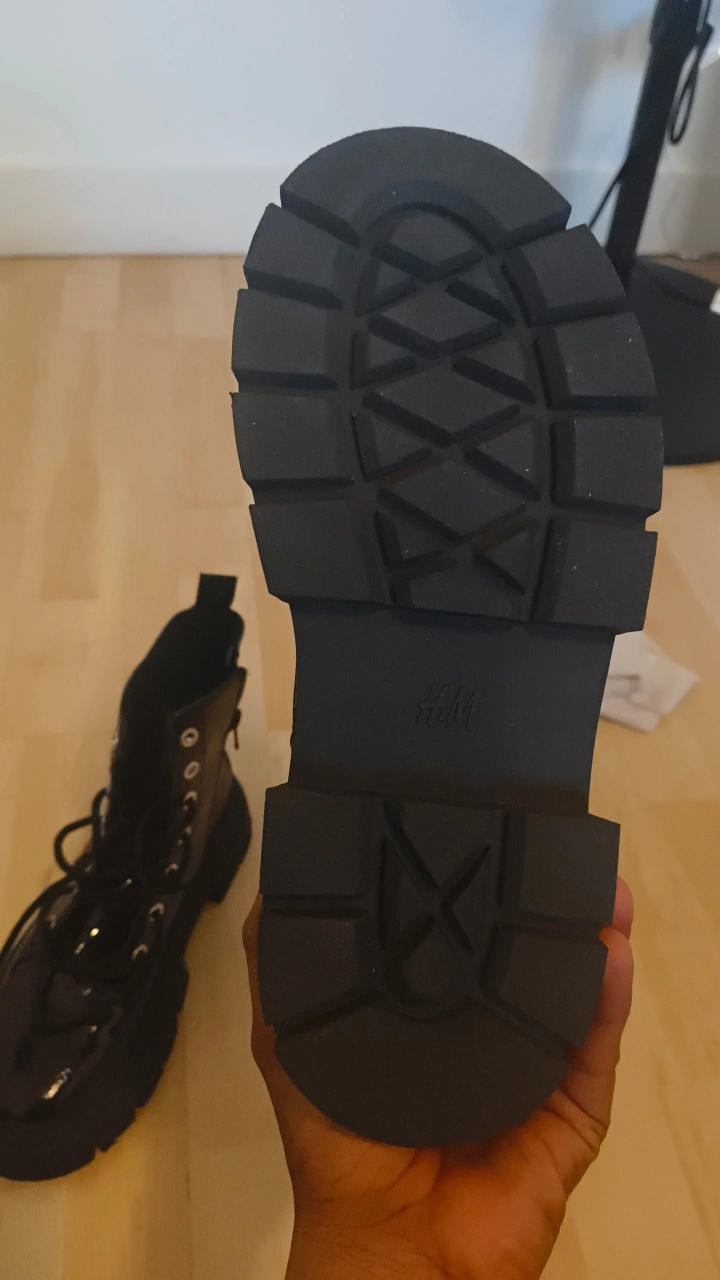 Selling a pair of H&M black patent leather boots. They're in great condition and have a lace-up design. Perfect for adding a bit of edge to any outfit!