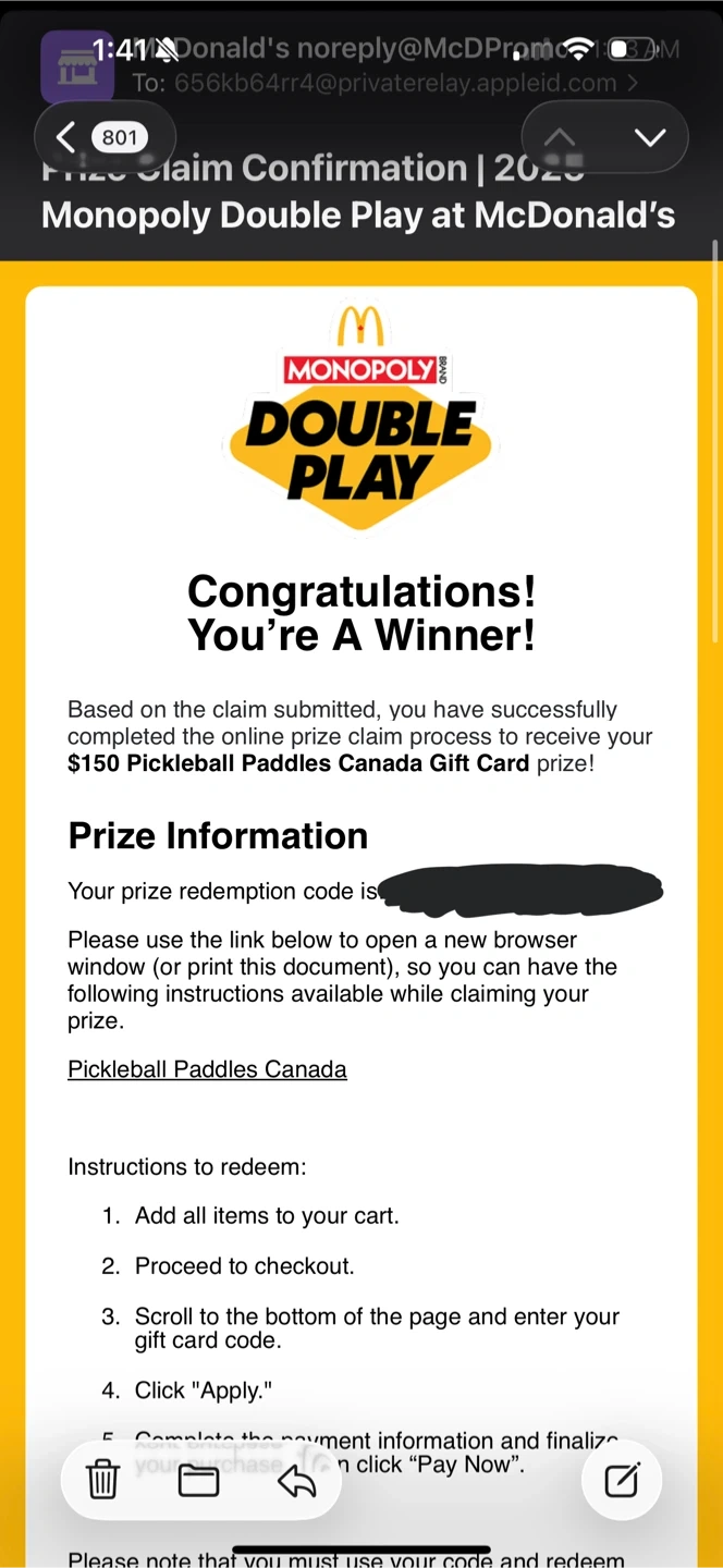 I'm selling a $150 gift card for Pickleball Paddles Canada. This was a prize from the Monopoly Double Play at McDonald's. Instructions to redeem are: Add all items to your cart, proceed to checkout, scroll to the bottom of the page and enter your gift card code, and click apply!